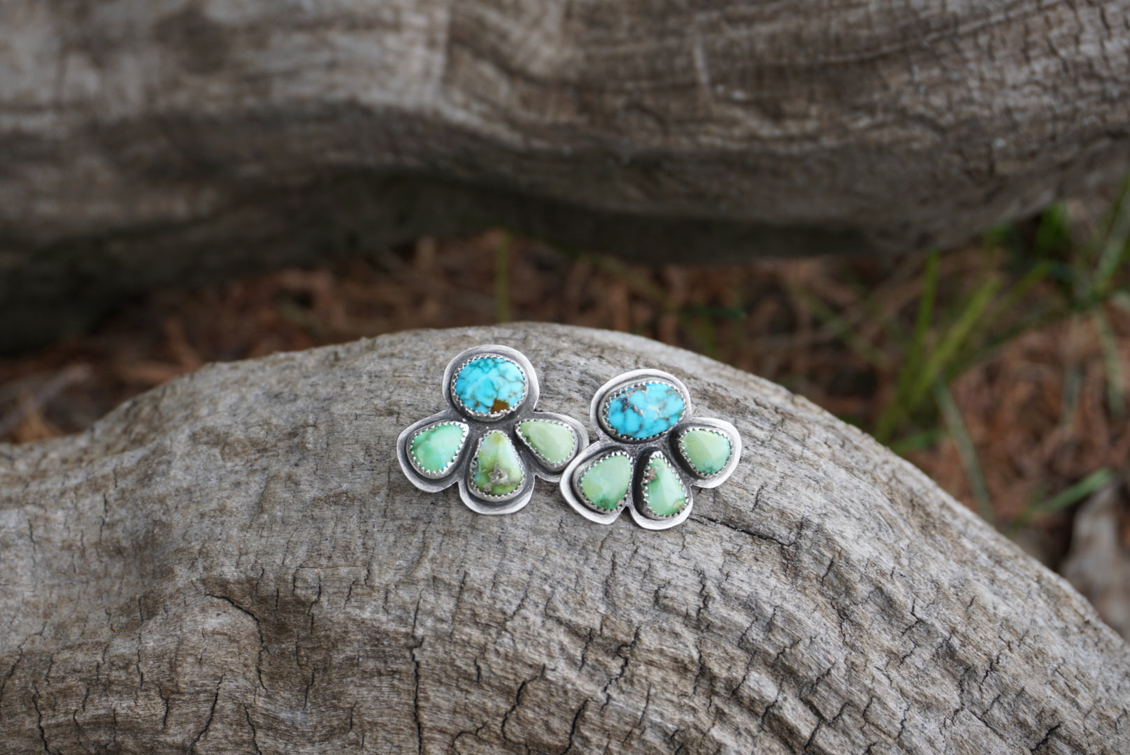 Absolutely Stunning. Gorgeous eight stone post earrings featuring two beautiful blue High grade Kingman Turquoise and six high grade minty green Sonoran Gold Turquoise. Each Wildflower design has the green Sonoran Gold teardrops fanning out below the vibrant blue Kingman turquoise ovals. Earrings are oxidized and polished for a soft rustic finish with sterling silver earnuts. These measure about .75 inches from the top of the post earring to the base and they are about 1 inch across at their widest point.