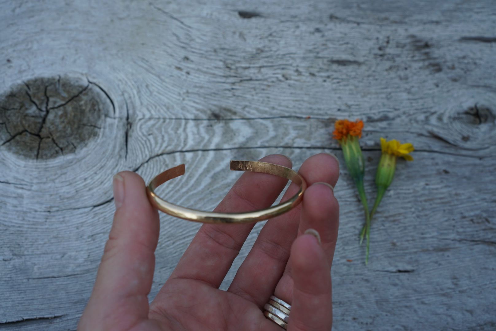 This listing is for one cuff. Hand shaped and hammered half round 14K Gold Fill stacking cuff. Simple and beautiful. Perfect to wear alone or stacked up with multiple other bracelets. Thin enough for comfort, thick enough to be noticed. Two sizes available, Small/Medium 5.5 inches in length (65mm at widest point with 25mm opening) or Medium/Large 6 inches in length (70mm at widest point with 25mm opening). Can be bent to open and squeezed to shut.