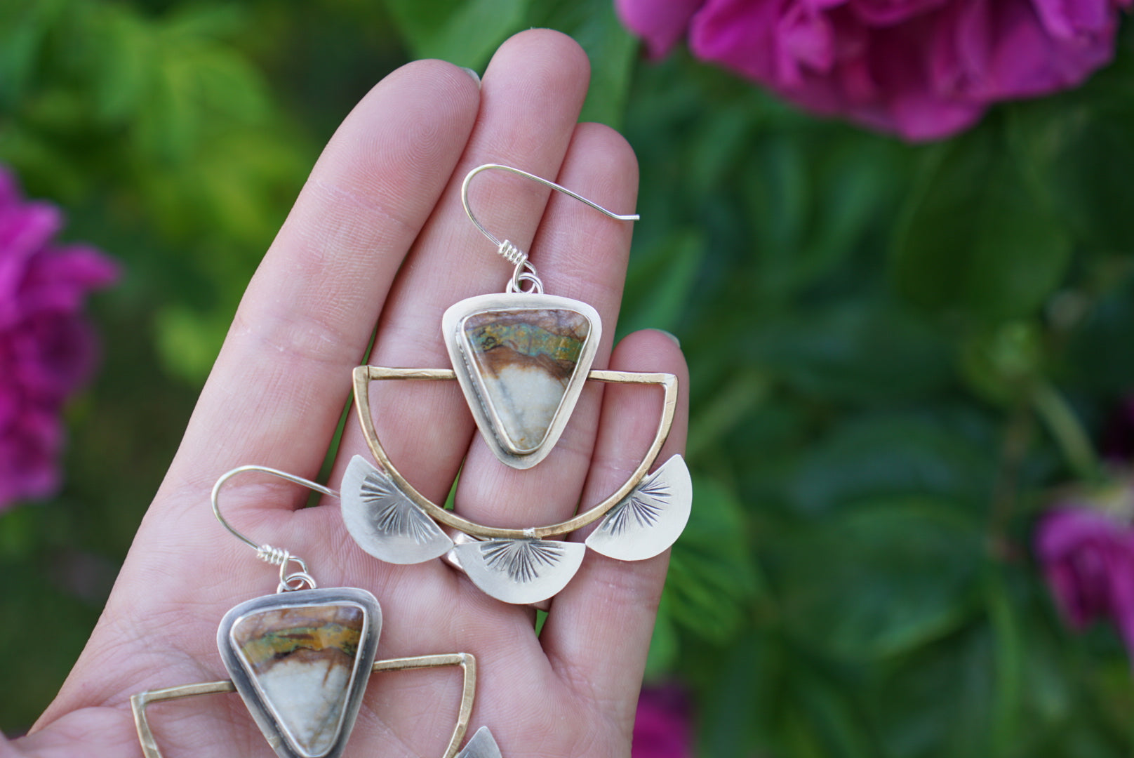 Stunning half hoops made of hand shaped brass loops, completed with pretty little half moons at the base with a little burst of light detail on them and paired with stunning earthy Royston Ribbons gemstones. The stones colors include cream, browns and green in the matrix. Earrings dangle from hand crafted sterling silver ear wires and hang about 2.5 inches in length.