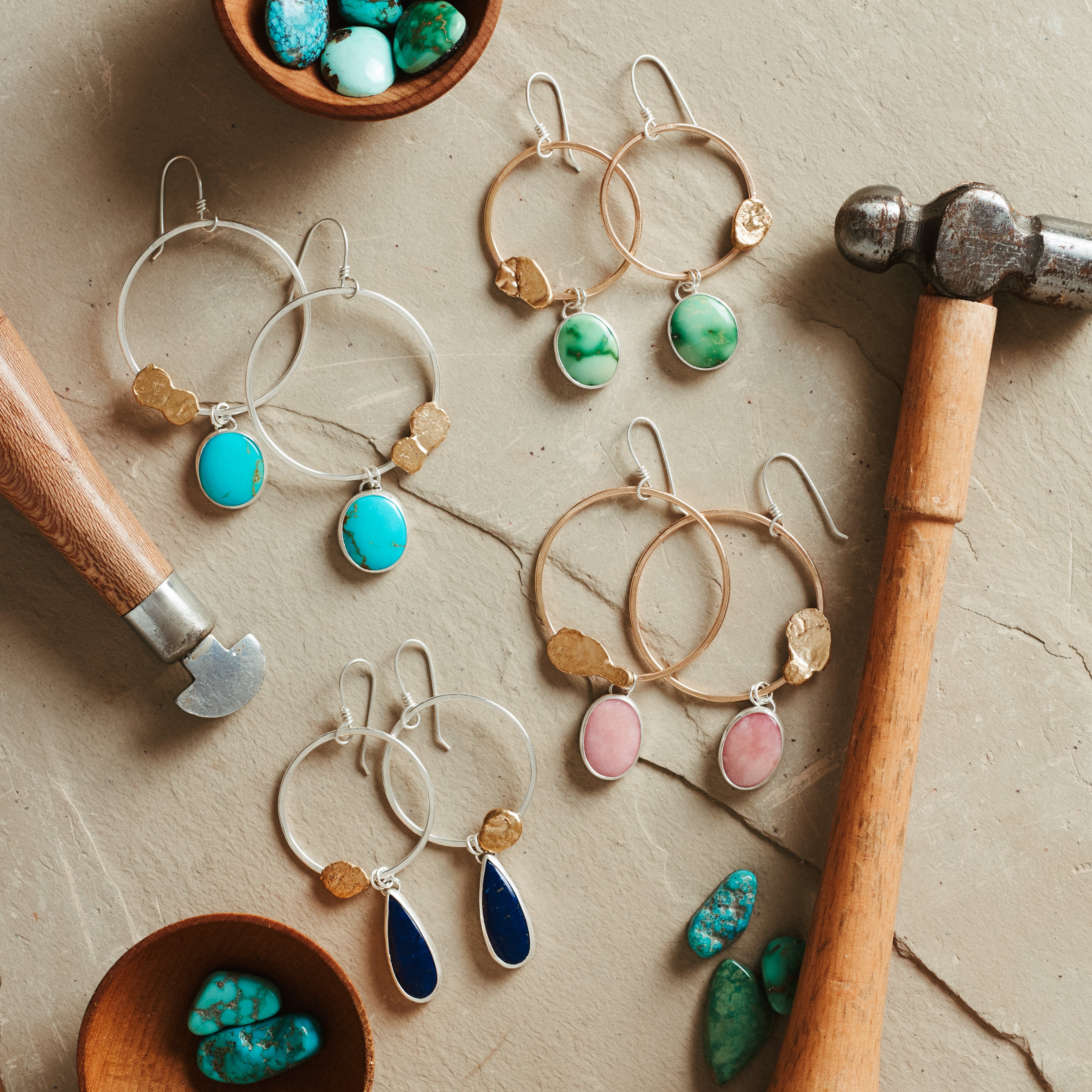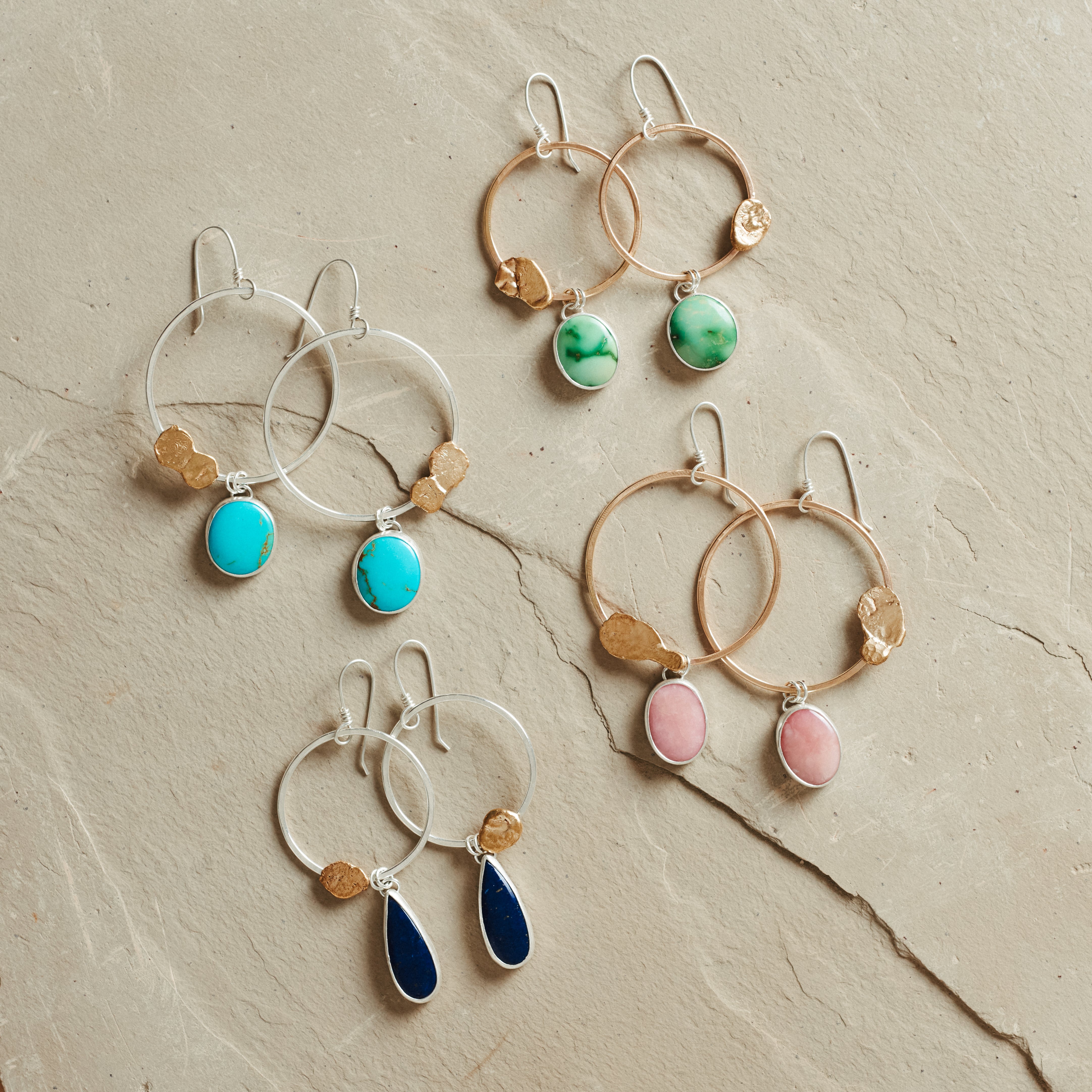 Stunning hoops featuring Peruvian Pink Opal stones set simply in sterling silver and dangling below hand shaped 14k gold fill brass hoops, with organic shaped hand pressed brass details on the hoop. Earrings dangle from hand crafted sterling silver ear wires and hang about 3.25 inches in length.