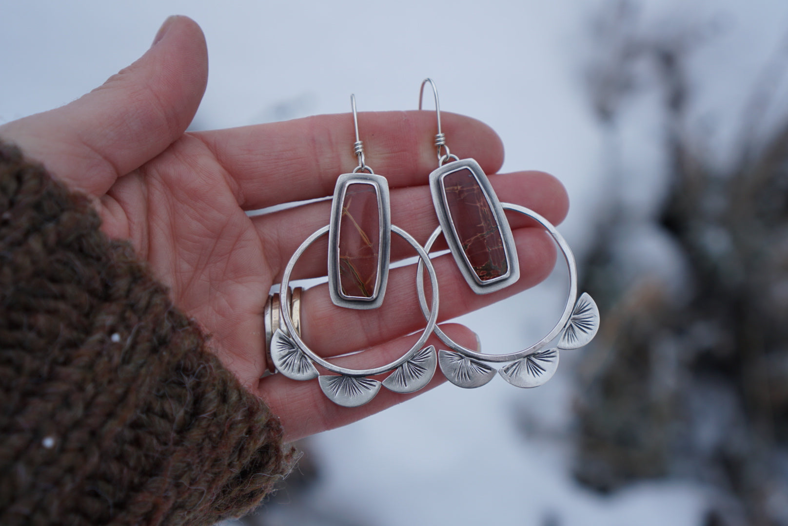 Stunning hoops made of hand shaped sterling silver loops, completed with pretty little half moons at the base with a little burst of light detail on them and paired with stunning Red Cherry Creek Jasper gemstones. Earrings dangle from hand crafted sterling silver ear wires and hang about 2.75 inches in length.