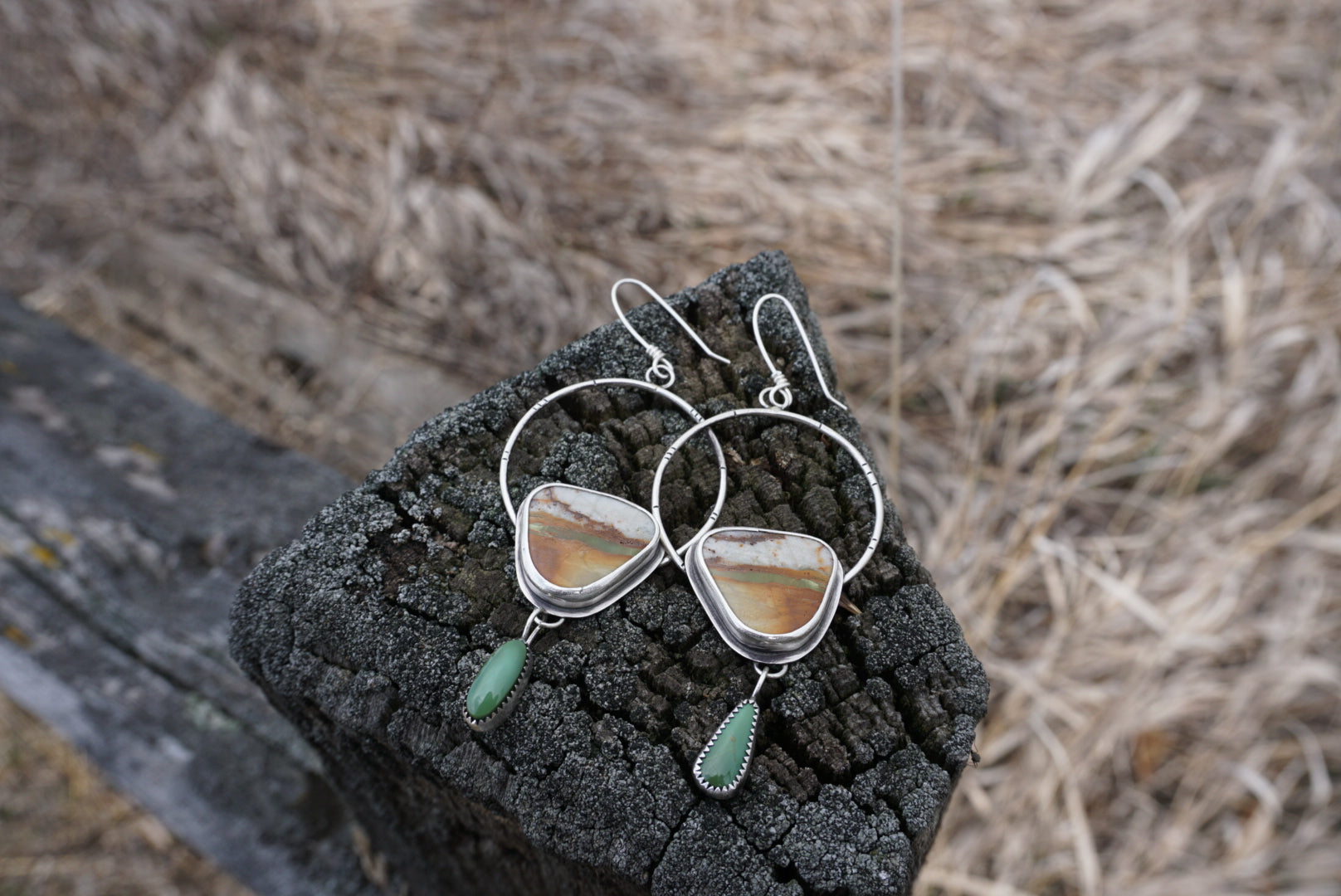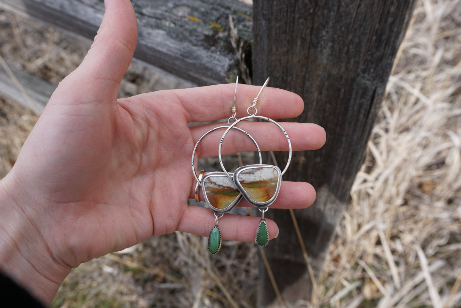 Beautiful hunks of Ribbon Turquoise are simply set in fine silver and nestled at the base of large handmade hoops with gorgeous Royston turquoise accent stones dangling below. Earrings feature hand stamped detail along the hoops and are oxidized and polished for a soft rustic glow and dangle from handmade sterling silver earwires. Earrings measure about 3.5 inches in length.