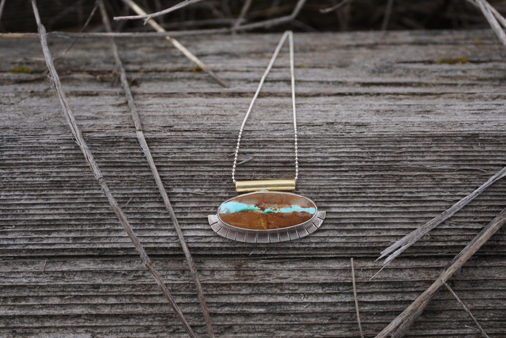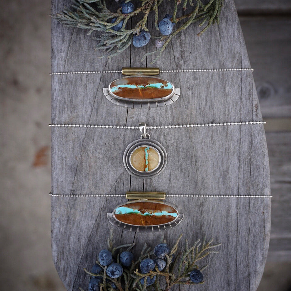 A big beautiful piece of American mined Royston Ribbon Turquoise is set in fine and sterling silver. Pendant has hand sawed fan detail along the bottom half and is finished with a brass tube shank. I get major Egyptian vibes from this beauty. Necklace is completed with a dainty but sturdy sterling silver ball chain that measures 18 inches in length.