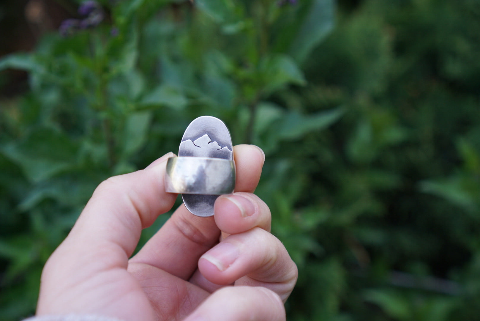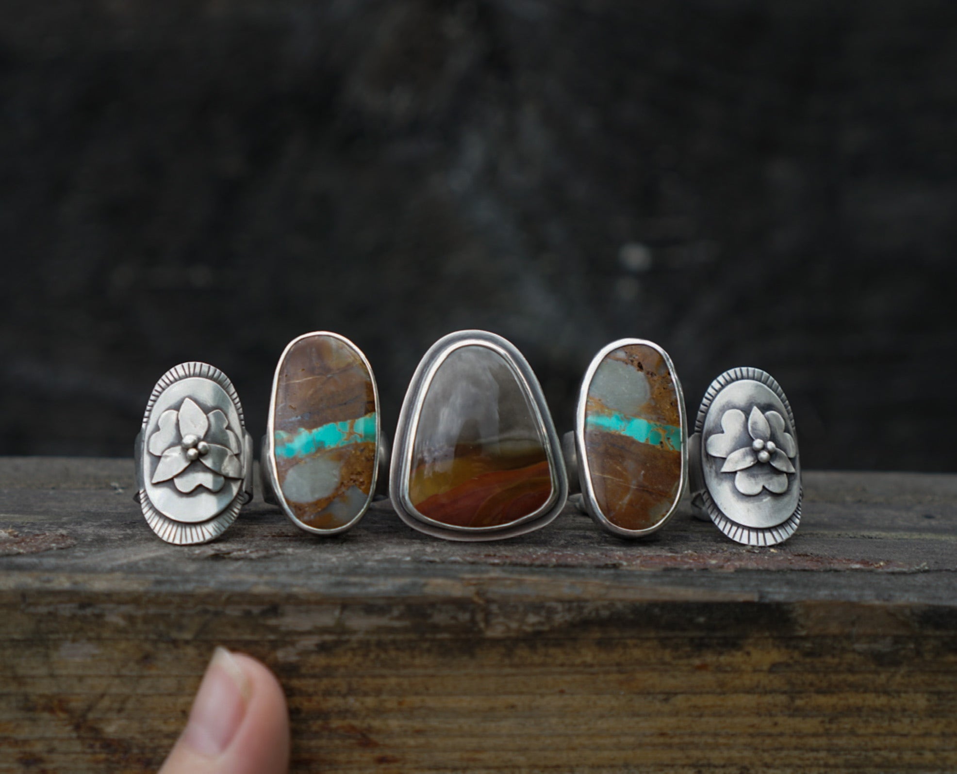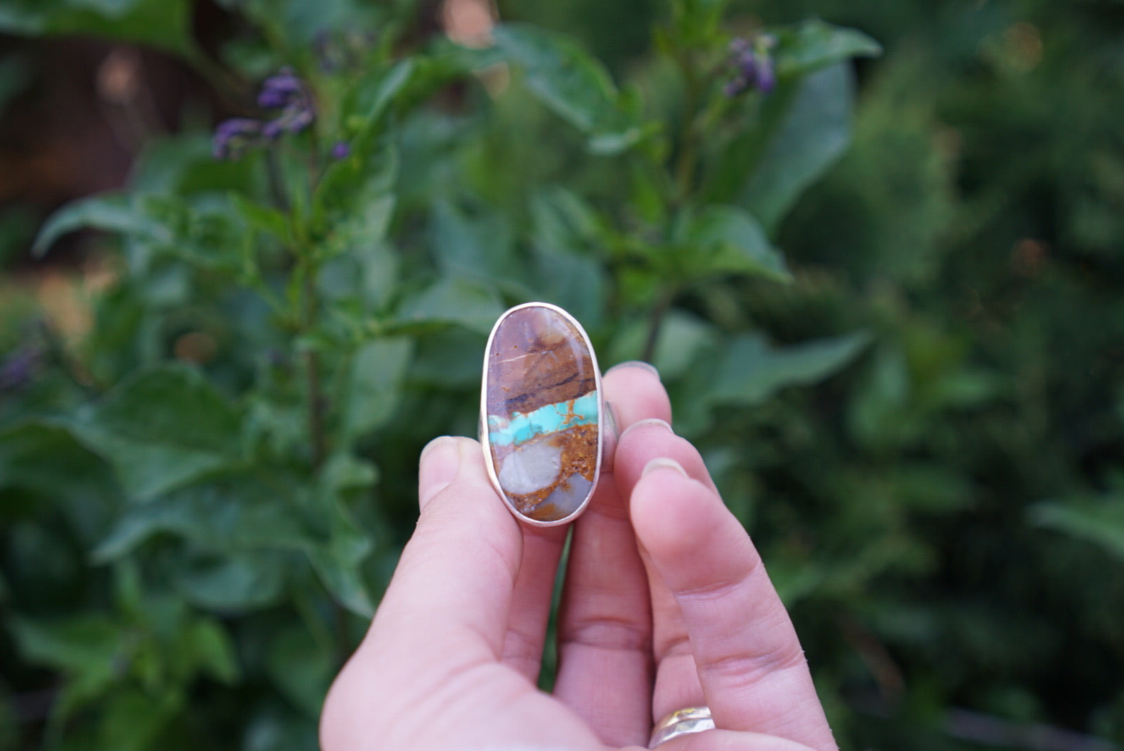 A beautiful thick hunk of Royston Ribbon Turquoise is simply set in recycled sterling silver with a simple sturdy extra wide ring band. A very interesting stone with a grey and brown matrix and a  blue green turquoise river running through the middle. Ring is oxidized and polished for a soft rustic finish. Size 8