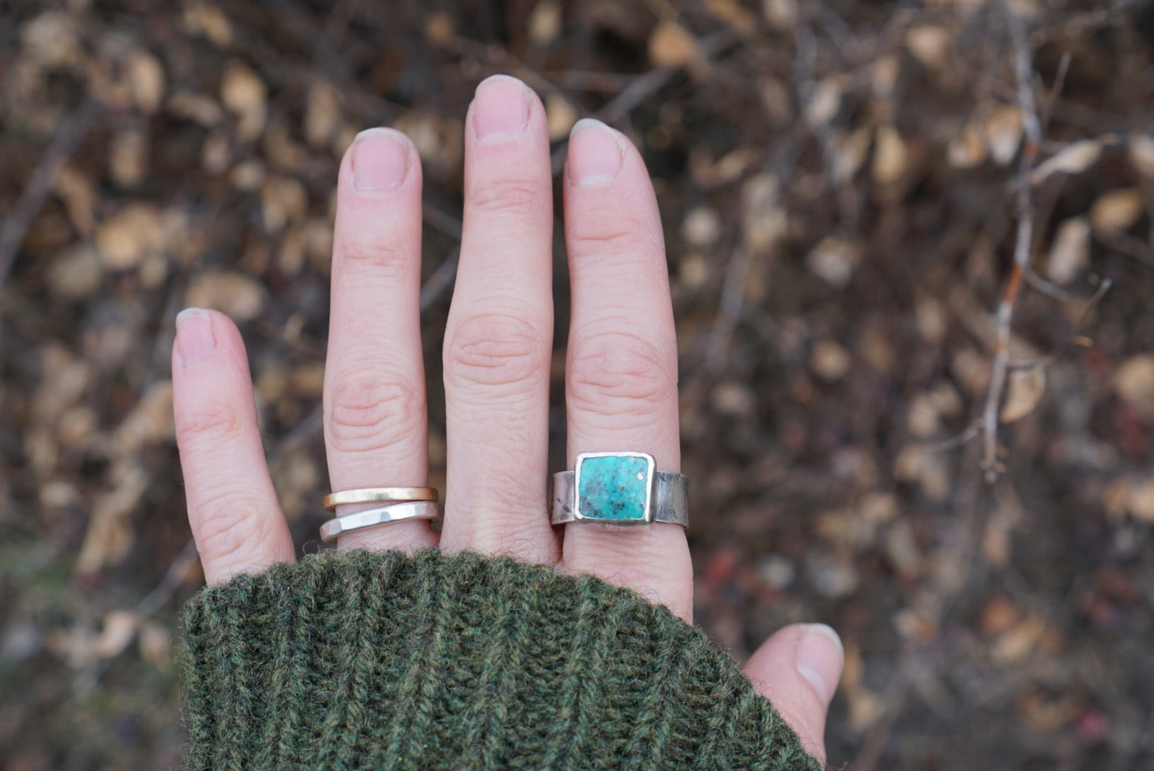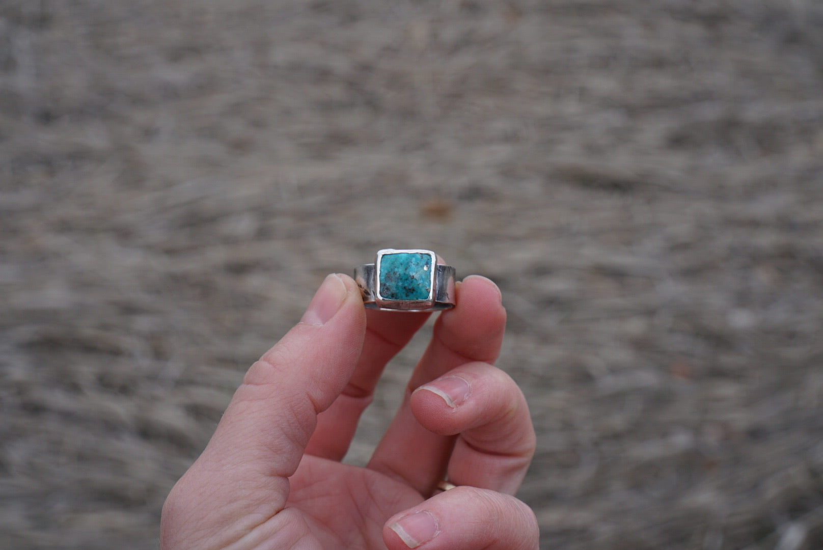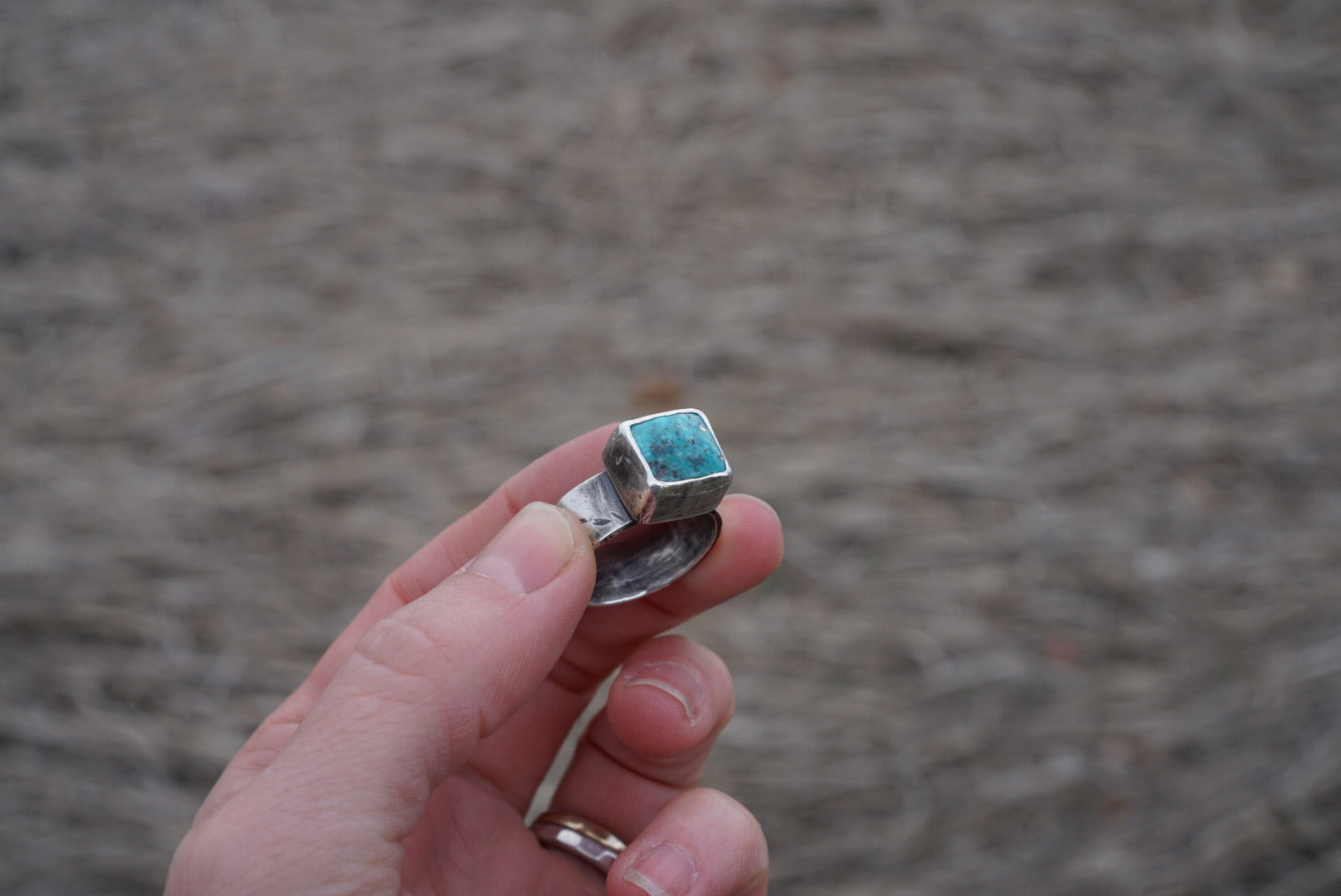A pretty little square Kingman Turquoise slice is set in a thich cube like setting and perched atop a rustic wide ring band. This ring is the perfect for the everyday. Oxidized and polished for a soft rustic finish. Ring is a size 8.5.