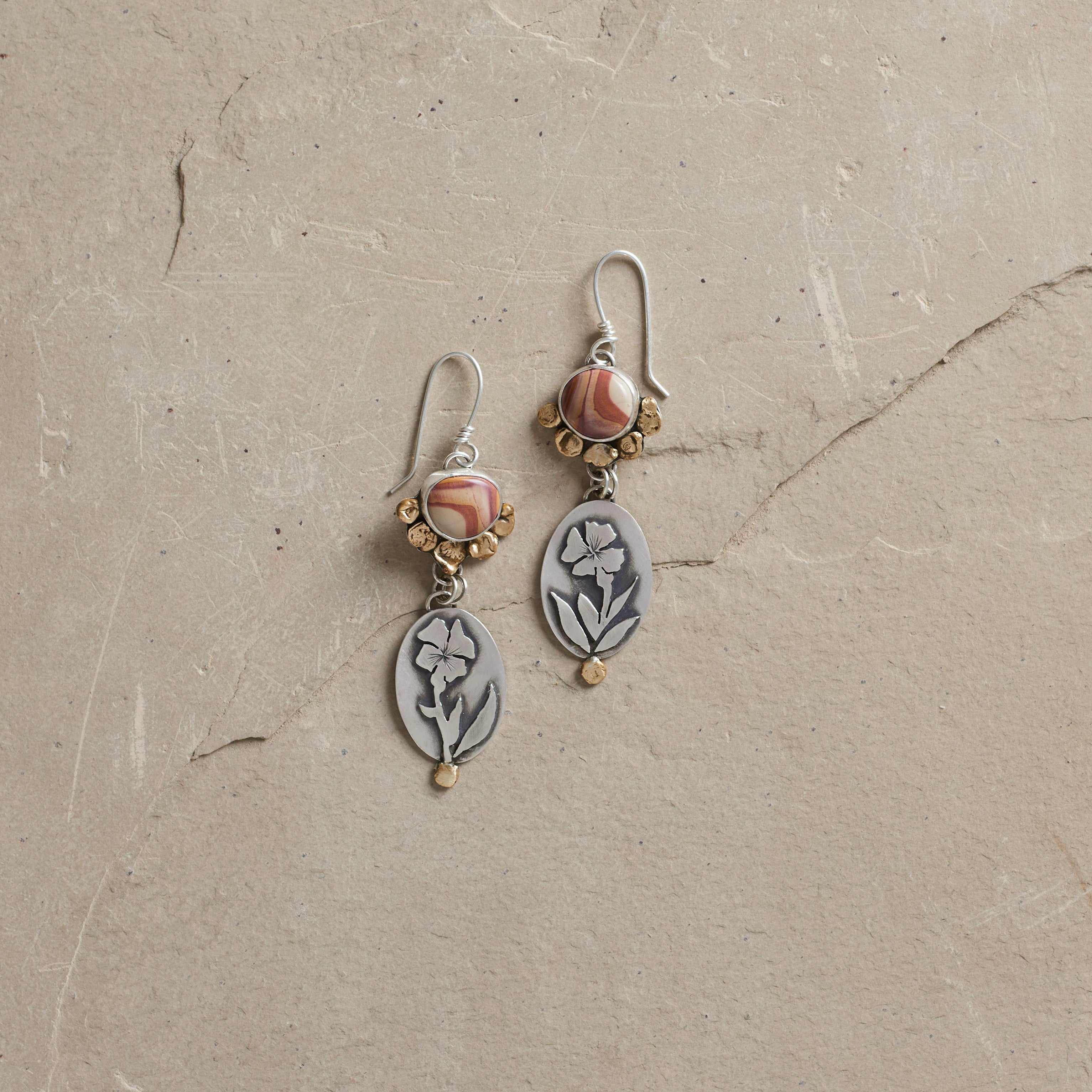 Gorgeous earrings featuring locally mined and cut Montana Wonderstone gemstones set inside gorgeous pressed brass and sterling silver settings. Dangling below are beautiful amapola flower scenes that are hand drawn, sawed and appliquéd onto oval discs with brass details. These earrings have nice movement and are oxidized and polished to accent the details. These measure 2.75 inches long and hang from handcrafted sterling silver earwires.