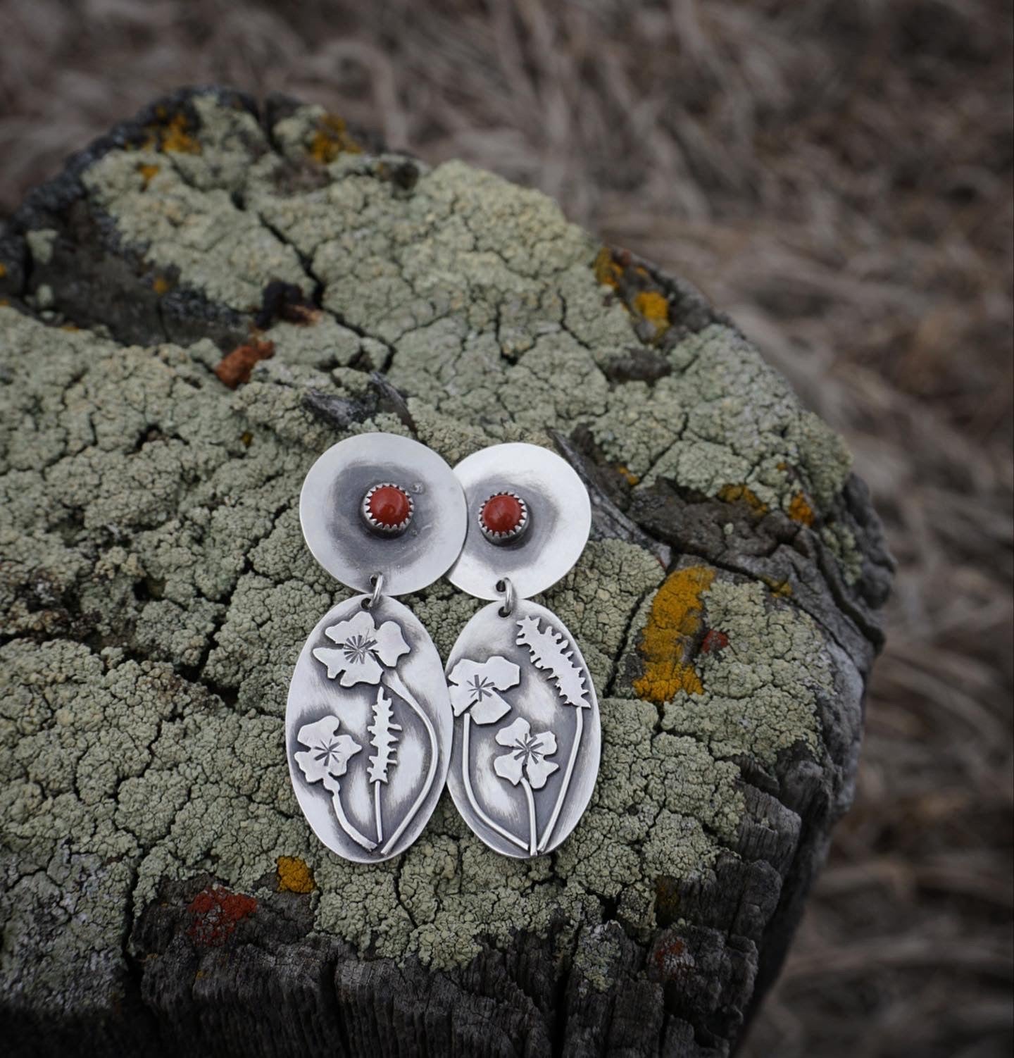 Gorgeous earring featuring Red Jasper rounds simply set on disc post earrings. Dangling below are beautiful  Flower scenes that are hand drawn, sawed and appliquéd to larger oval discs. These earrings have nice movement and are oxidized and polished to accent the details. These measure 2.25 inches from the top of the post to the base of the larger oval.