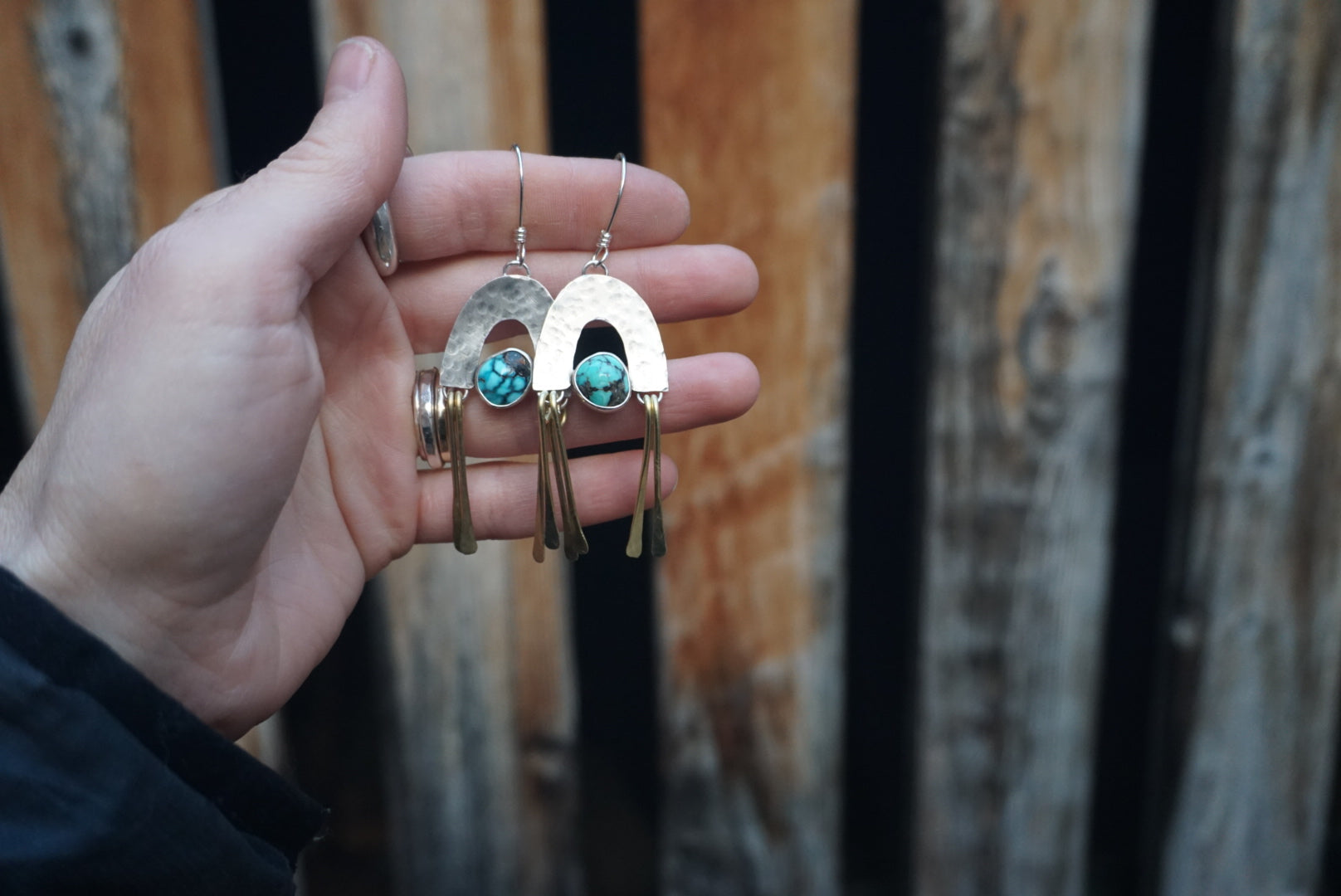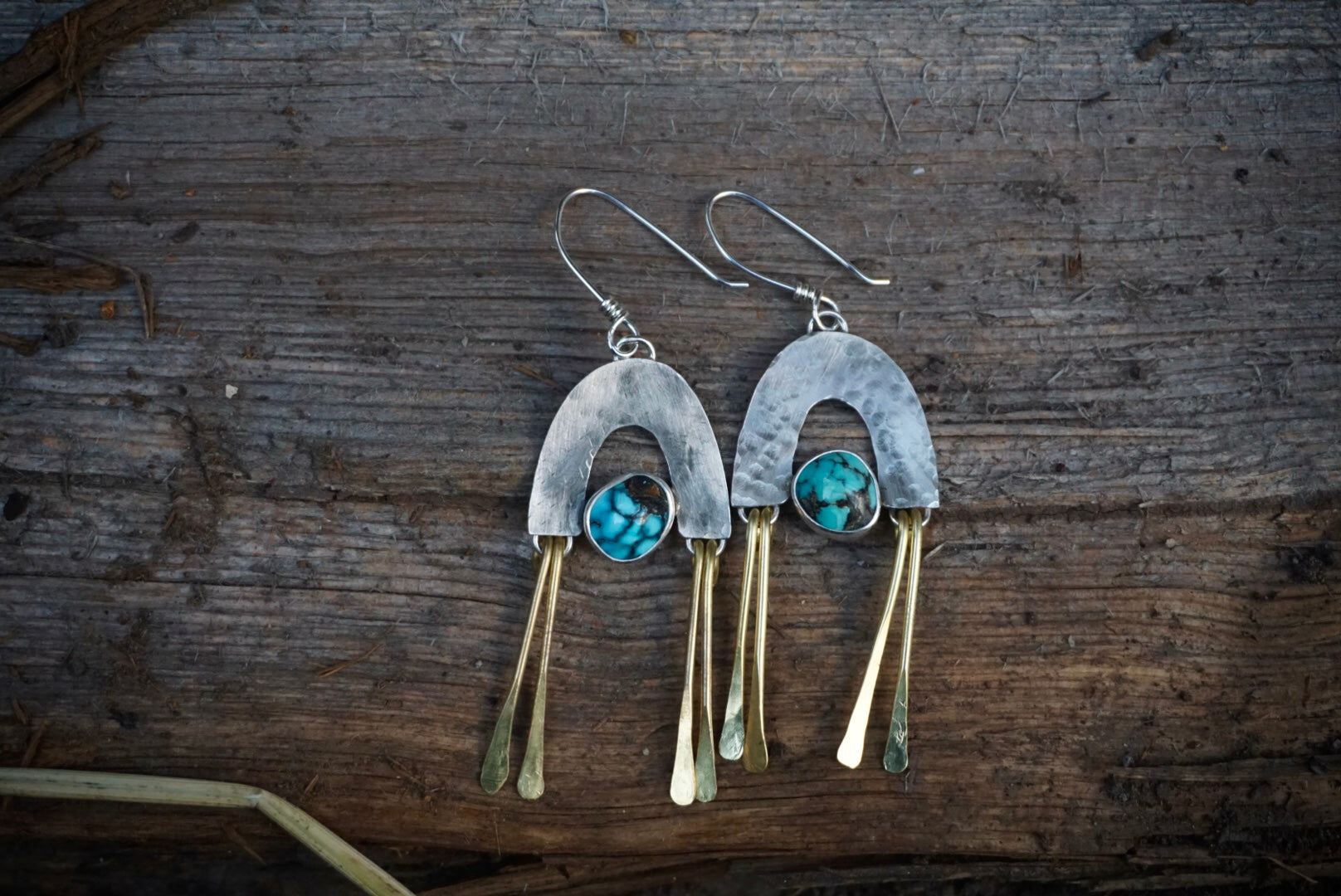 Absolutely stunning pair of earrings featuring gorgeous American mined Carlin turquoise stones nestled inside arches constructed of raw recycled sterling silver with brass fringe dancing on each side of the arch. These are perfect medium sized earrings and light and comfy. Earrings are oxidized and polished for a soft rustic glow and are finished with handmade sterling silver earwires. These hang just about 2 inches long from the top of the earwires to the base or the earring.