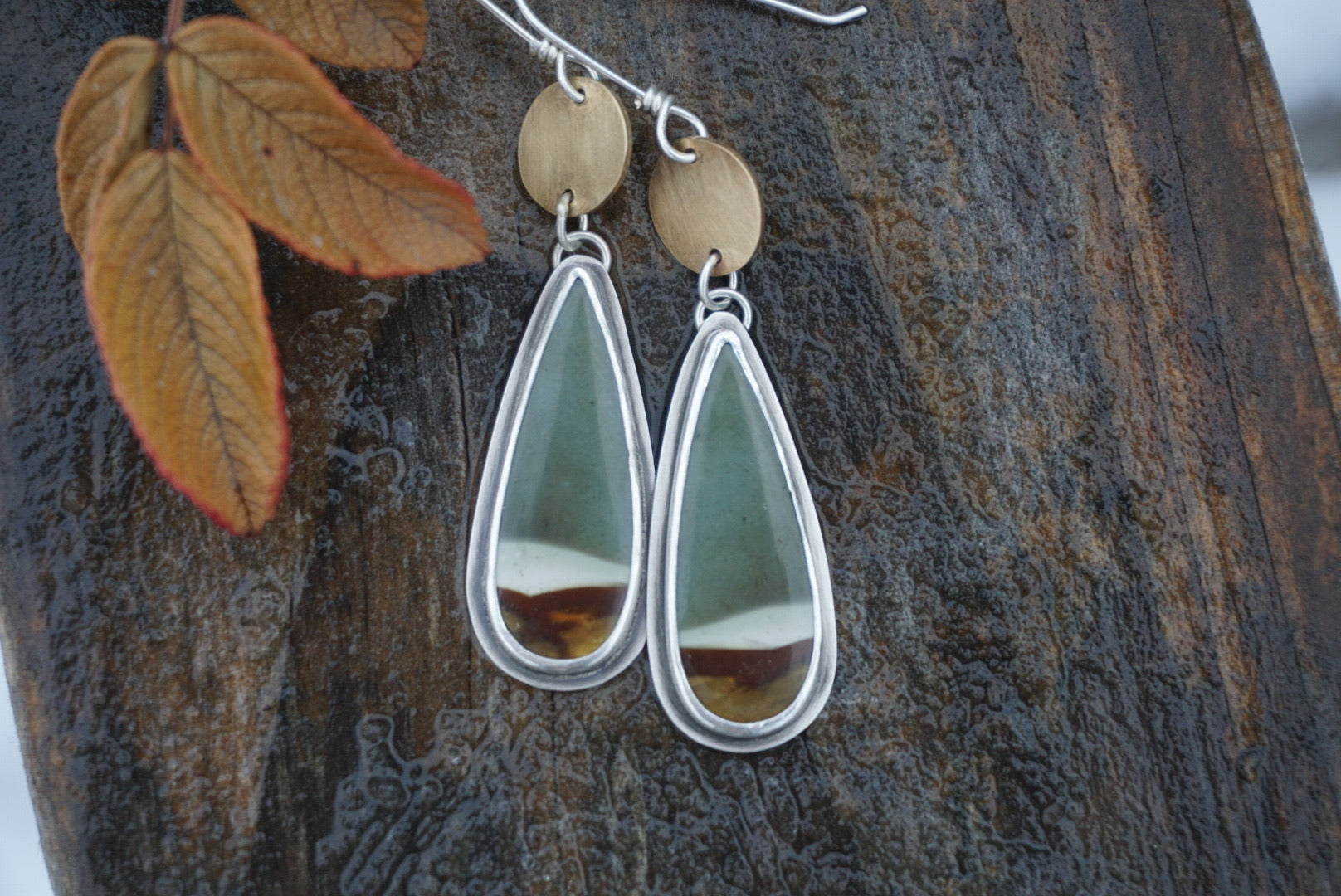 Incredible slices of Picture Jasper from Oregon are nestled inside simple recycled sterling silver settings and dangle from little hand cut brass accent discs. These earrings are simple but amazing and have lots of movement. Oxidized and polished for a soft rustic glow and are finished with handmade sterling silver earwires. These hang just about 2.75 inches long from the top of the earwires to the base of the earring.