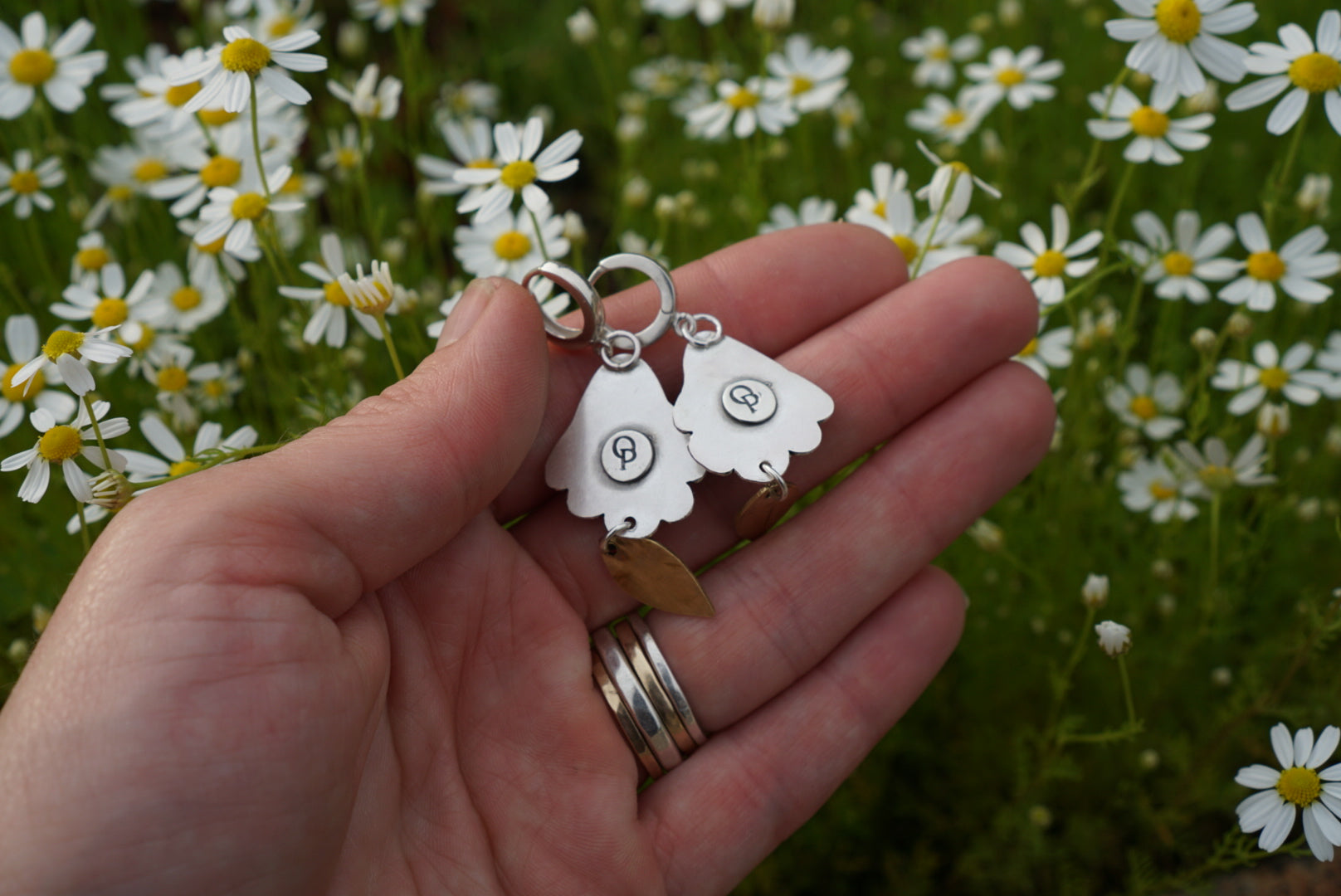 The cutest little huggie hoop earrings! Beautiful slices of turquoise are wrapped in silver with sunburst detail along the bottom and little petal shaped brass charms dangling below. Gemstones are looped on sturdy silver lever clasp huggie hoops! This is the best of mixed metal goodness! Please be mindful with the delicate hoops. These measure around 2 inches long.