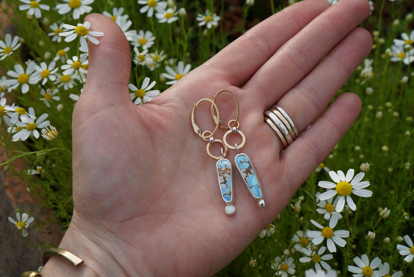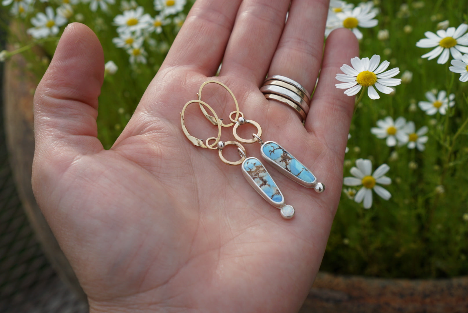 The cutest little asymmetrical lever back hoop earrings! Beautiful slices of lavender turquoise are wrapped in silver with a silver ball detail at the bottom of one and an opal detail at the bottom of the other, these gems hang below 14k gold fill double hoops which are looped on sturdy 14k gold fill lever clasp hoops! This is the best of mixed metal goodness! Light, comfy and perfect for everyday! Please be mindful with the delicate hoops. These measure around 2.25 inches long.