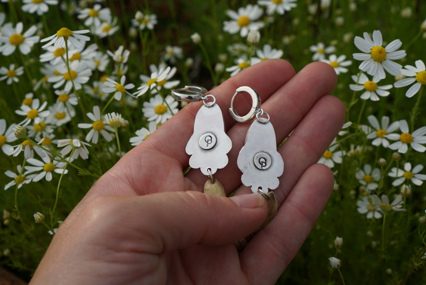 The cutest little huggie hoop earrings! Beautiful slices of lapis are wrapped in silver with sunburst detail along the bottom and little petal shaped brass charms dangling below. Gemstones are looped on sturdy silver lever clasp huggie hoops! This is the best of mixed metal goodness! Please be mindful with the delicate hoops. These measure around 2.25 inches long.