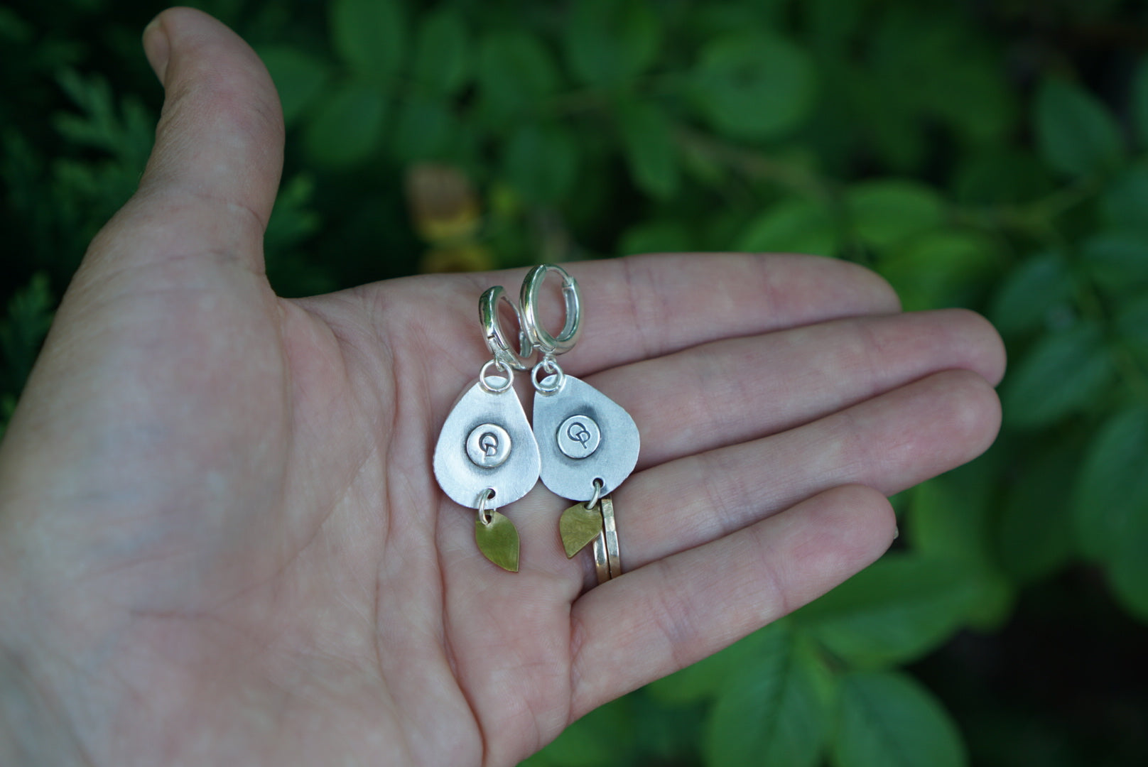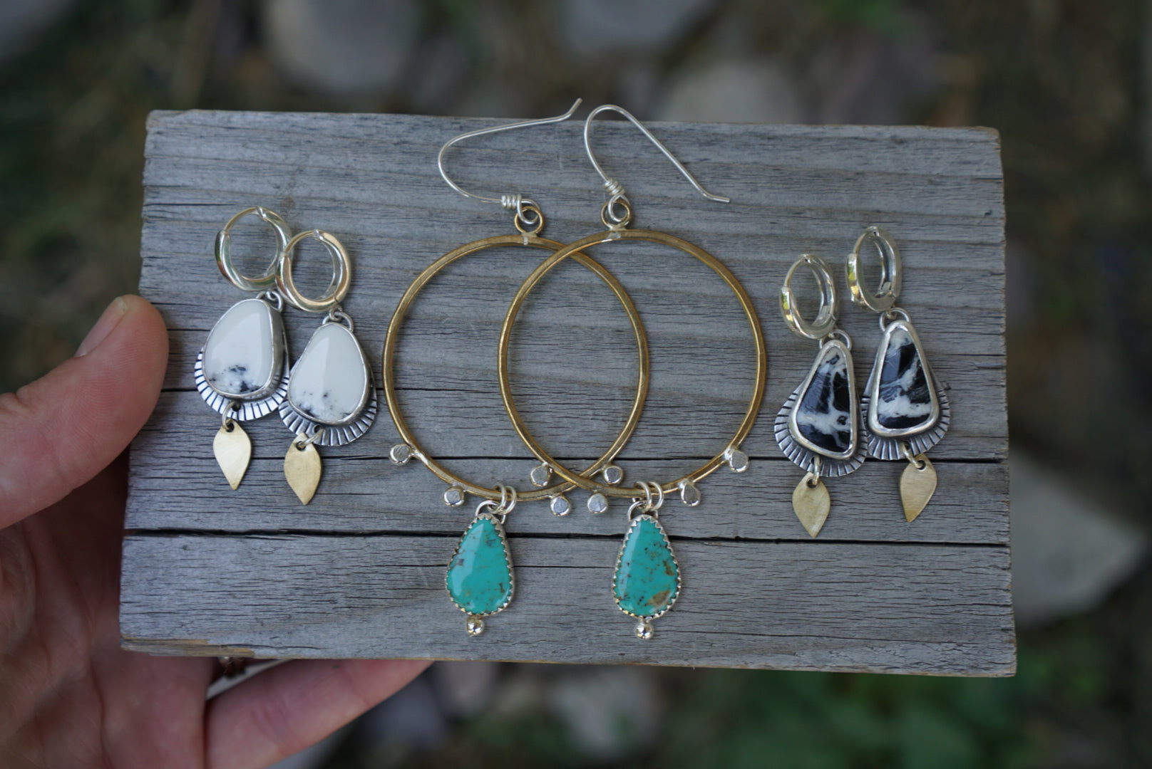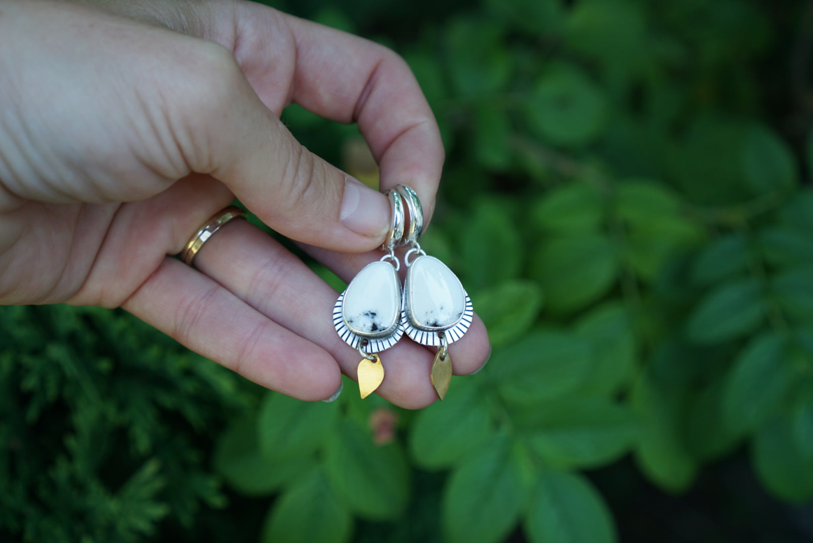 The cutest little huggie hoop earrings! Beautiful slices of White Buffalo are wrapped in silver with sunburst detail along the bottom and little petal shaped brass charms dangling below. Gemstones are looped on sturdy silver lever clasp huggie hoops! This is the best of mixed metal goodness! These measure around 1.75 inches long.