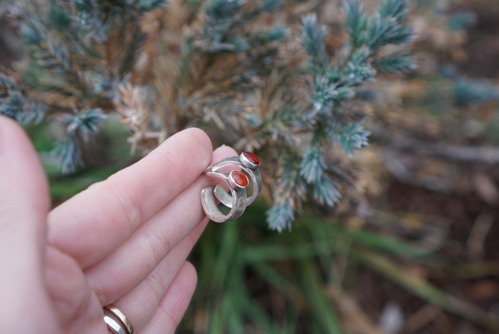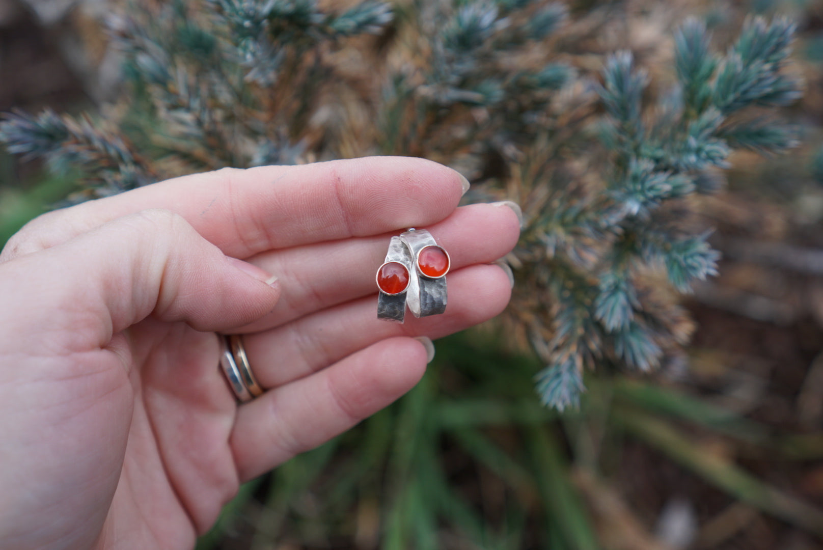 The cutest little huggie hoop earrings! Constructed of thick hammered sterling silver with small round gemstones perched on the curve. This pair features beautiful and shiny Red Carnelian. Great everyday earrings and come with heavy duty ear nuts to keep em in place! Hoops measure just over .5 inches in diameter.