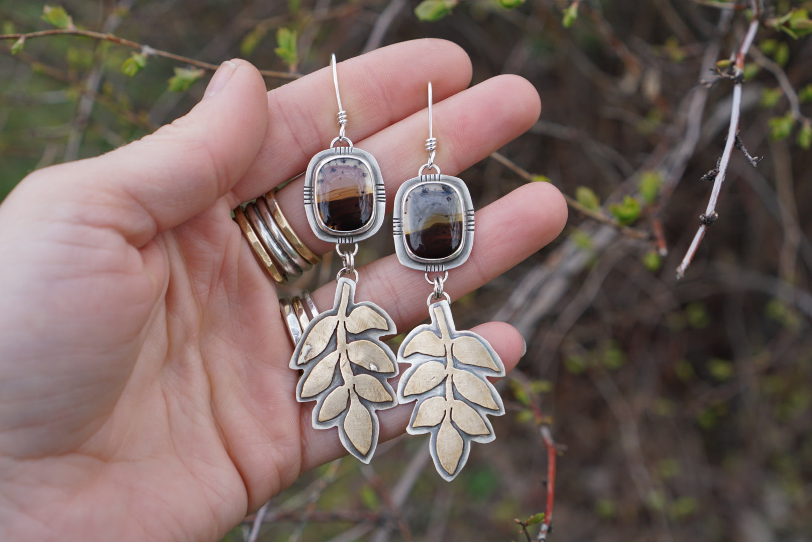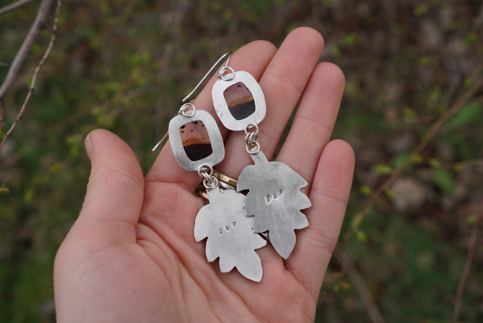 These gorgeous earrings are made with hand drawn and sawed brass tree boughs appliquéd on to sterling silver and perched below stunning slices of Montana Agate. The agates are set in window settings so light can shine through the stones.. These earrings are oxidized and polished for a soft rustic finish and hang from handcrafted sterling silver earwires. They measure almost 3.25 inches long and are a light comfy weight.