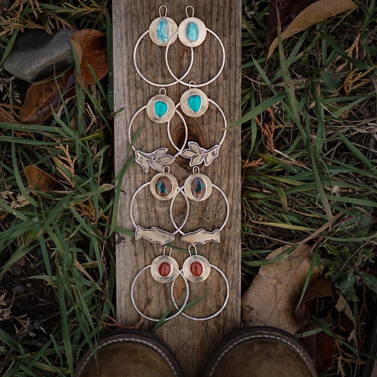 These gorgeous earrings are made with hand formed silver hoops with hand drawn and sawed brass brown trouts appliquéd on to sterling silver and perched on the hoop. Above are beautiful green and brown Royston Turquoise gemstones mounted on brass discs. These earrings are oxidized and polished for a soft rustic finish and hang from handcrafted sterling silver earwires. They measure almost 3 inches long and are pretty a light comfy weight.