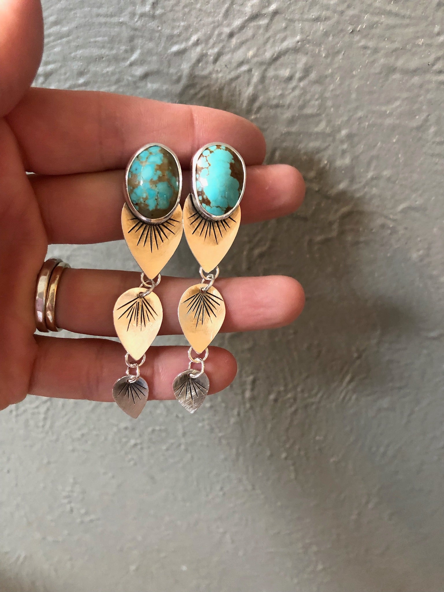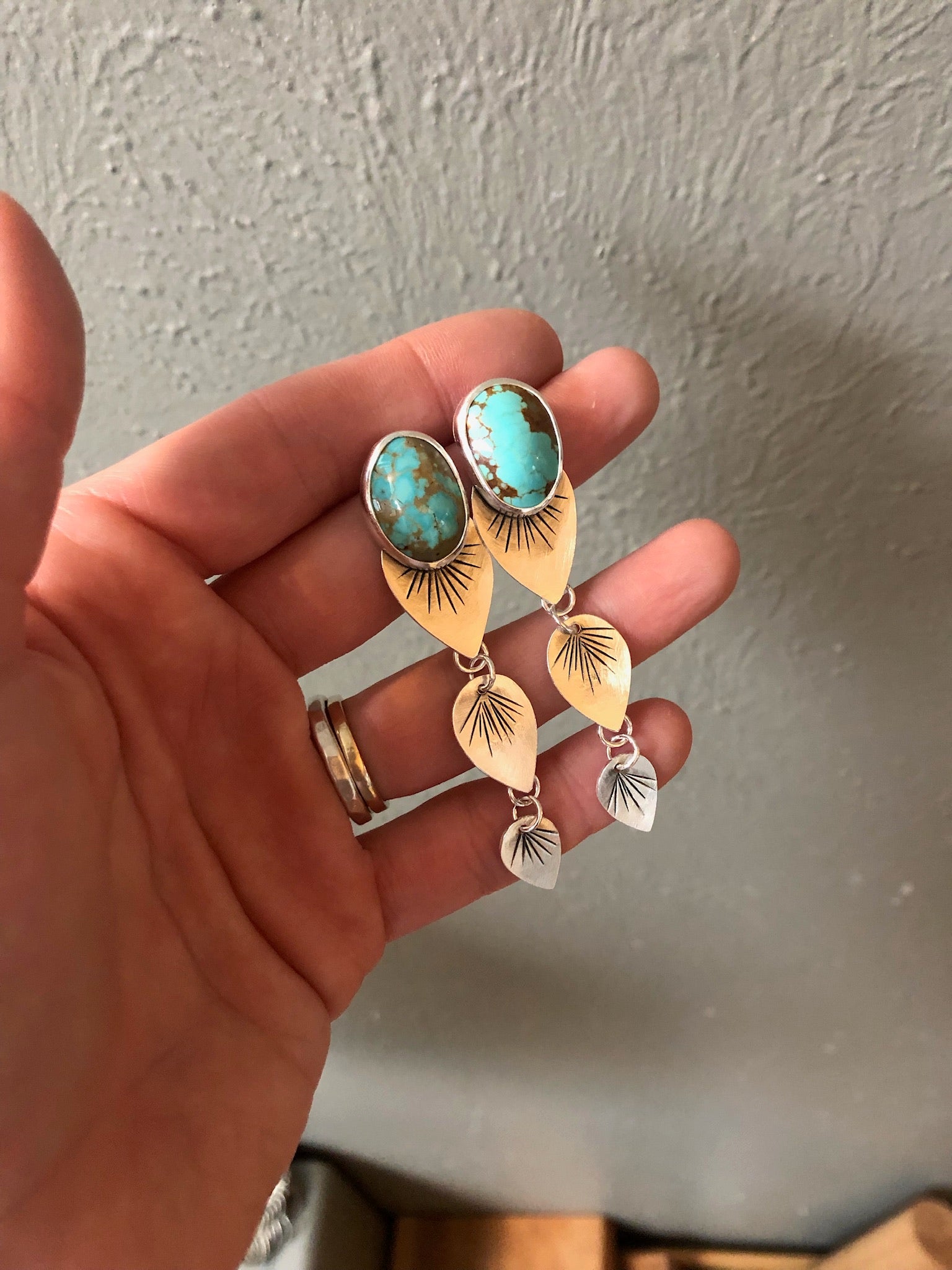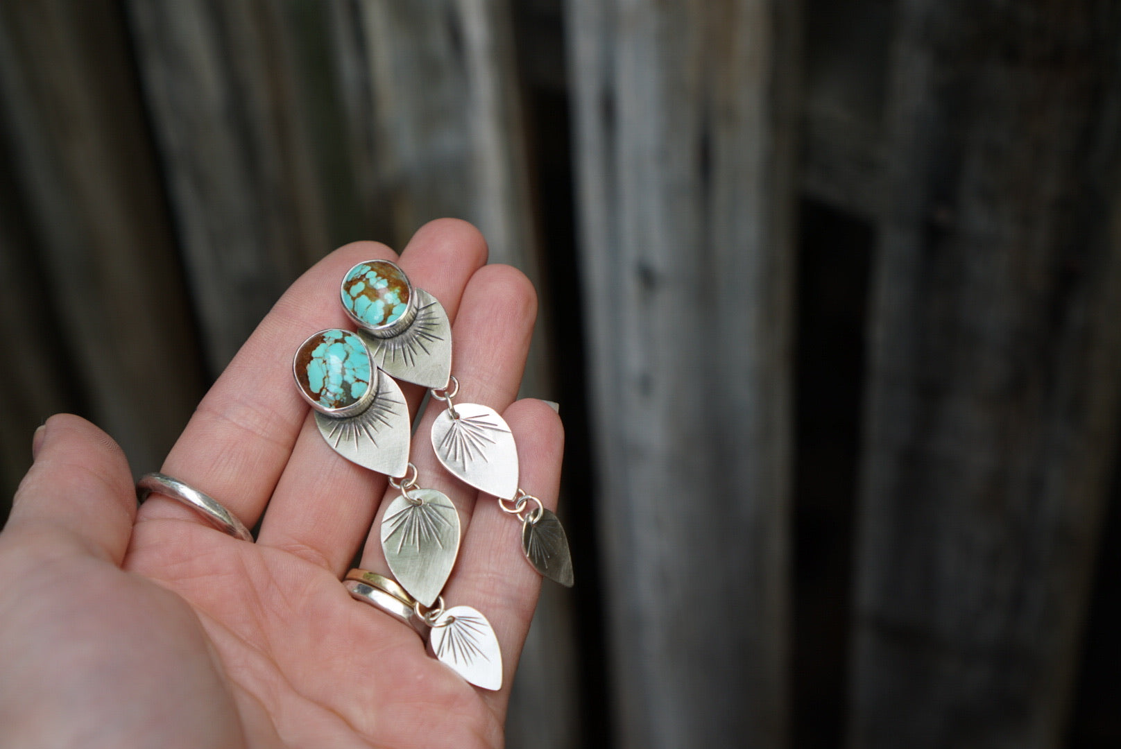 Beautiful, large, brown and blue Cumpas Turquoise chunks are simply set on handmade posts. Hand sawed and textured leaf shaped discs dangle below from large to small. Every link is soldered shut to ensure quality. Earrings are oxidized and polished for a soft rustic glow. Earrings measure 2.75 inches in length, are comfortable and have amazing movement. Finished with sterling silver earnuts. All handmade, all love.