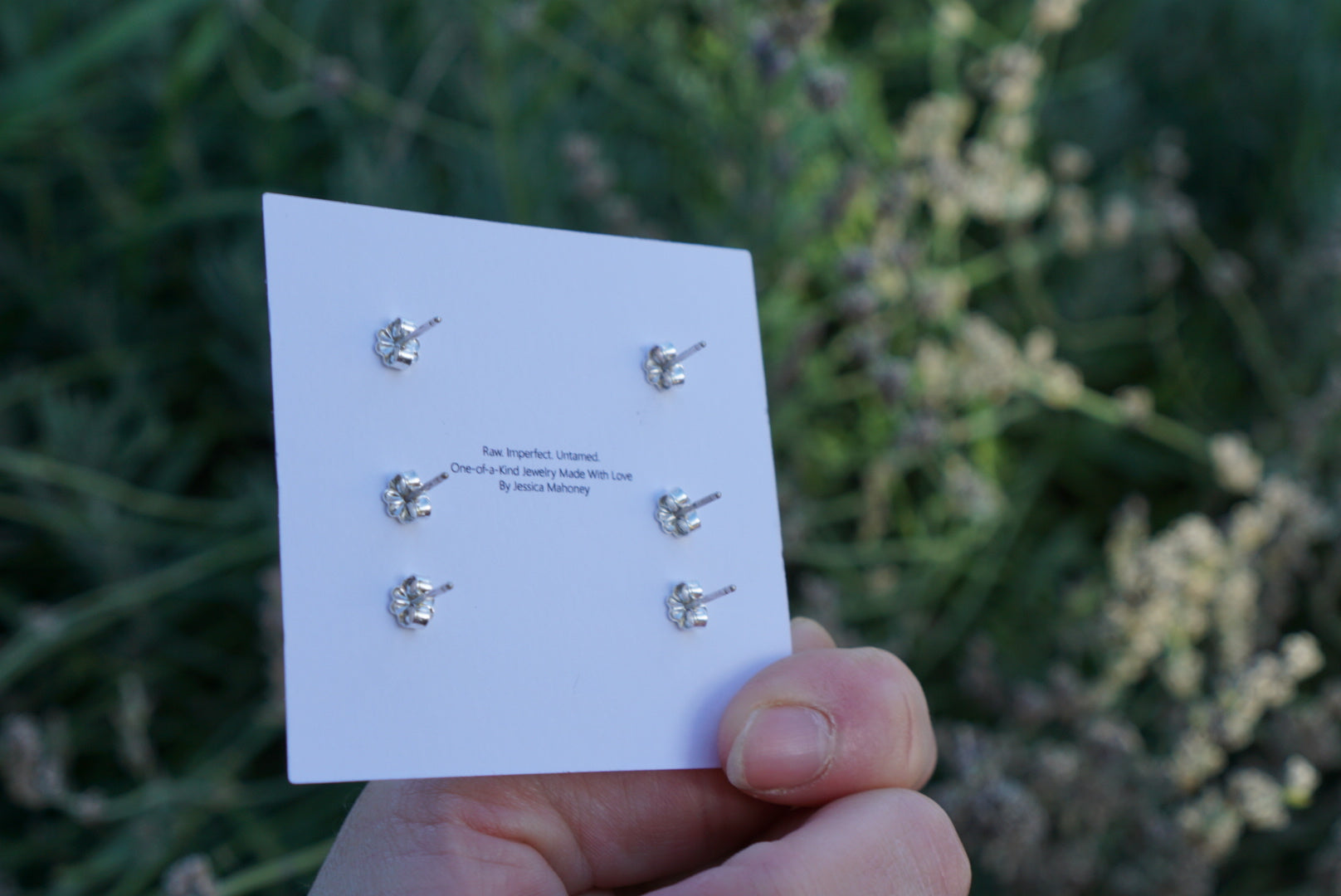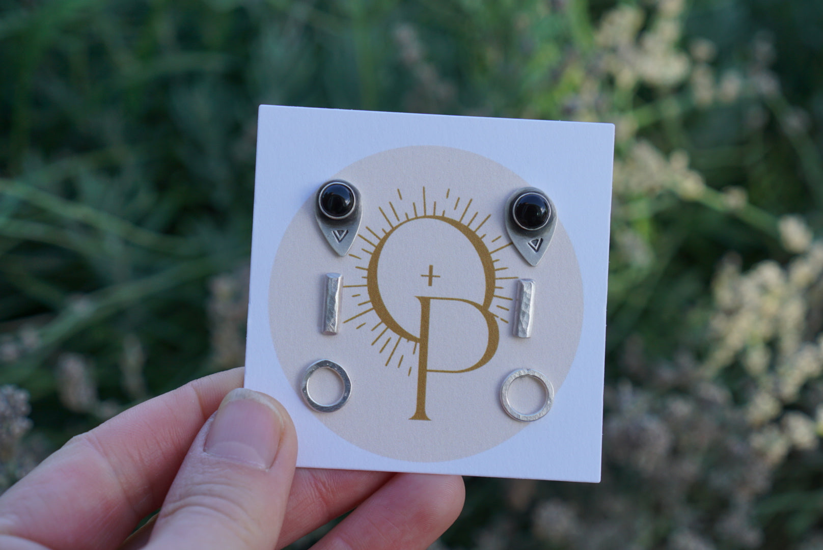Three perfectly basic pairs for post earrings. Featuring one pair with Black Onyx gemstones and triangle hand stamping, one pair of little sterling silver circles and one pair of teeny sterling silver hammered bars. All finished with sterling silver ear posts and sterling silver earnuts. The absolute perfect earrings for everyday.
