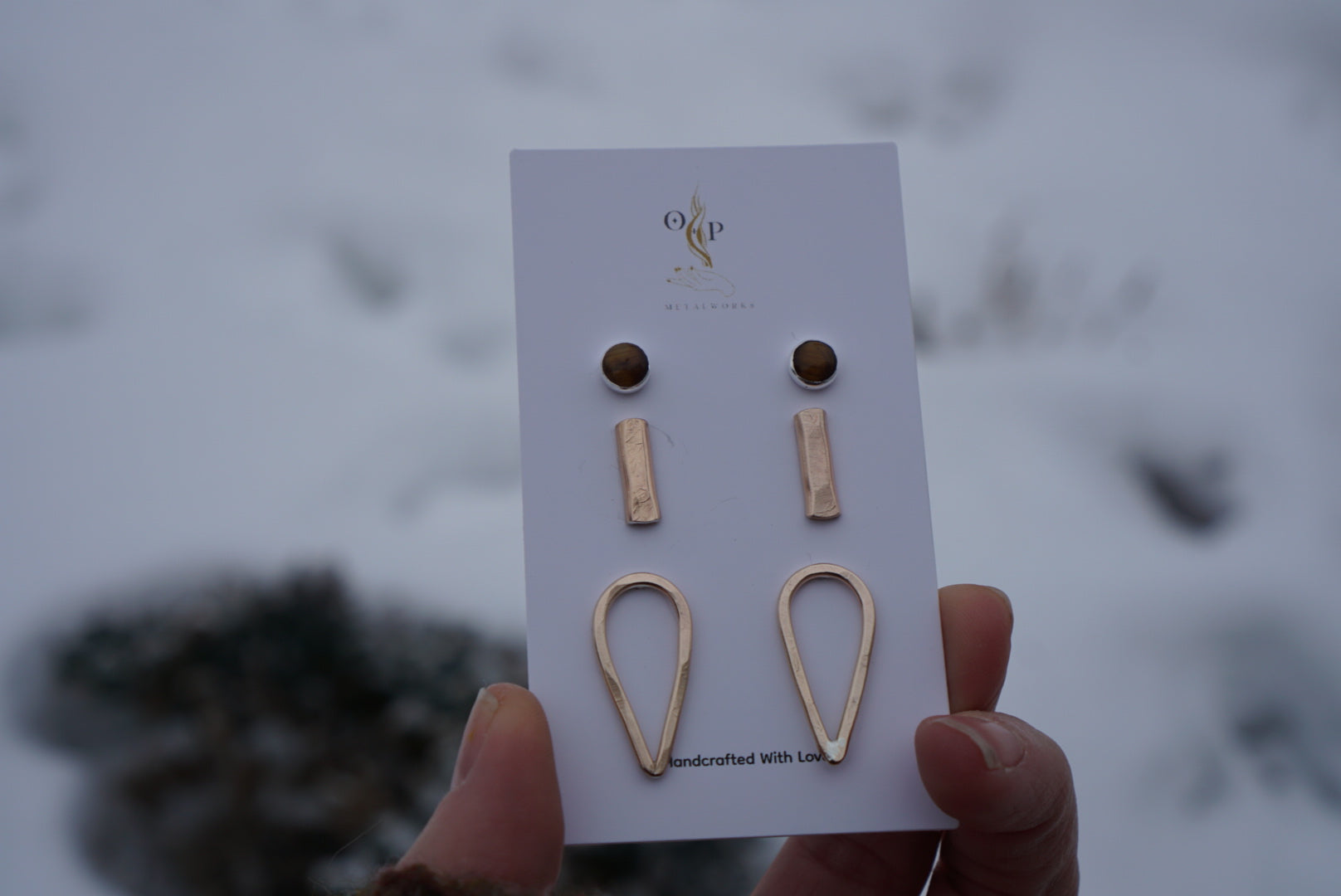Three perfectly basic pairs for post earrings. Featuring one pair of simple golden brown Tigers Eye gemstone posts, one pair of little 14K Goldfill hammered bars and one pair of 14K Goldfill inverted teardrop posts. All finished with sterling silver ear posts and sterling silver earnuts. The absolute perfect earrings for everyday.