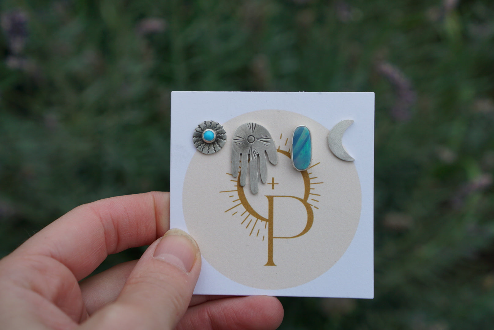 Four posts for mix and match. Sunburst post with blue turquoise, stamped Hand post, Australian Opal post, Crescent Moon post. All finished with sterling silver ear posts and sterling silver earnuts. The absolute perfect earrings for everyday.