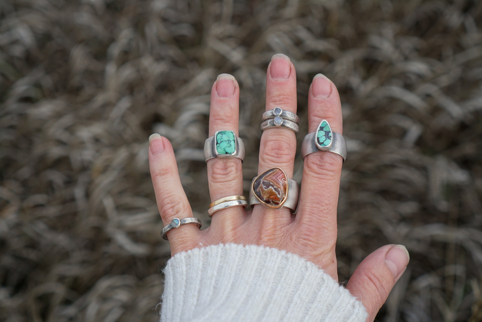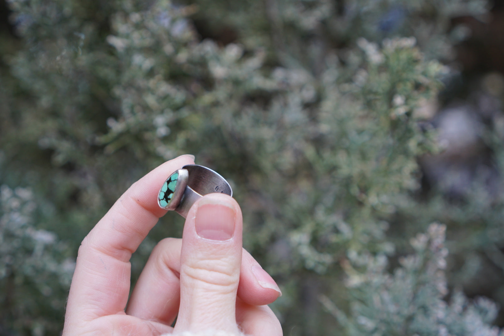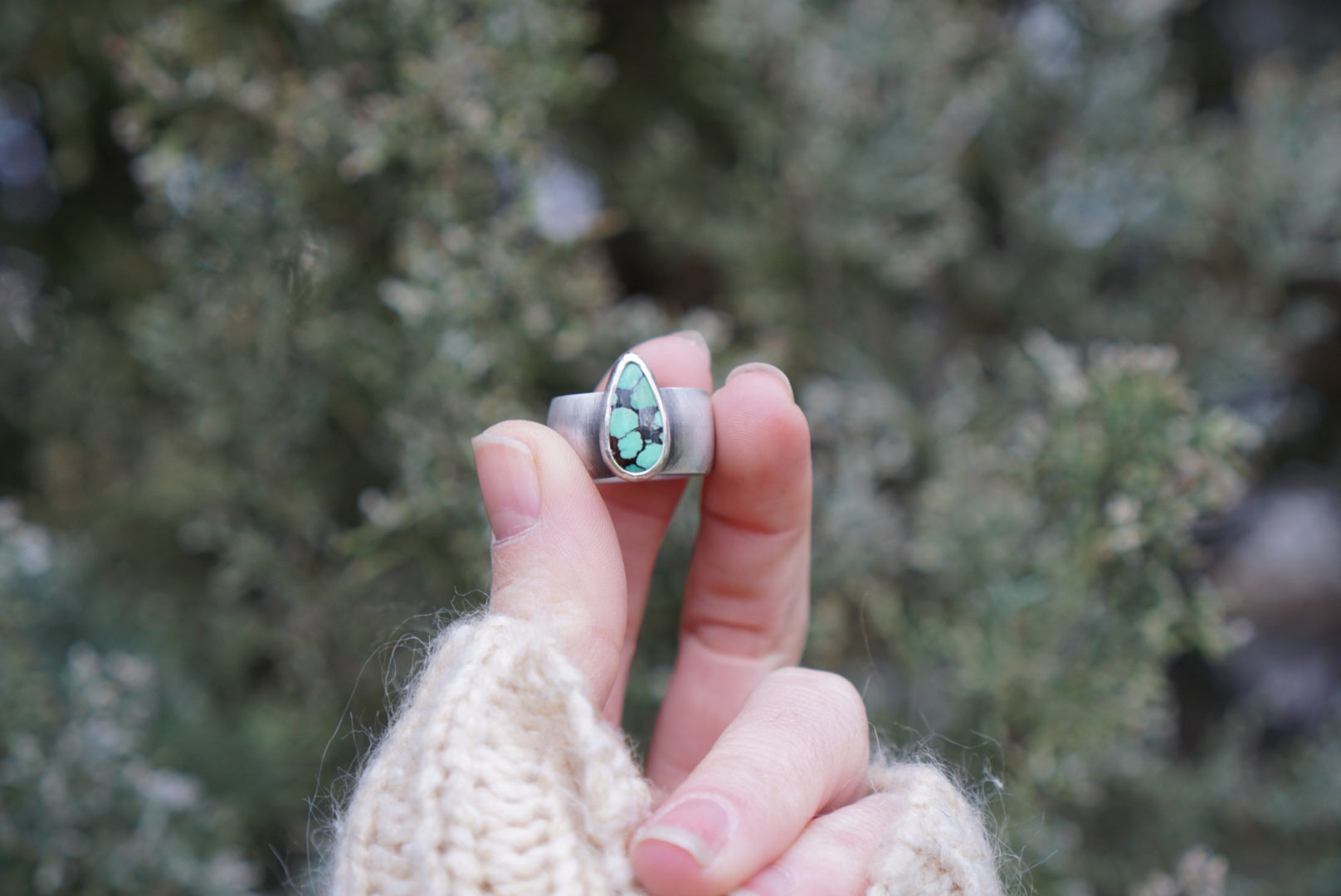 This gorgeous thick and hefty ring features a beautiful thick slice green and webby matrix American mined Turquoise. The chunky gemstone is nestled inside a thick sterling silver bezel and perched a hefty and wide domed ring band creating a sturdy and comfortable fit. The ring band is extra thick and measures a size 7.