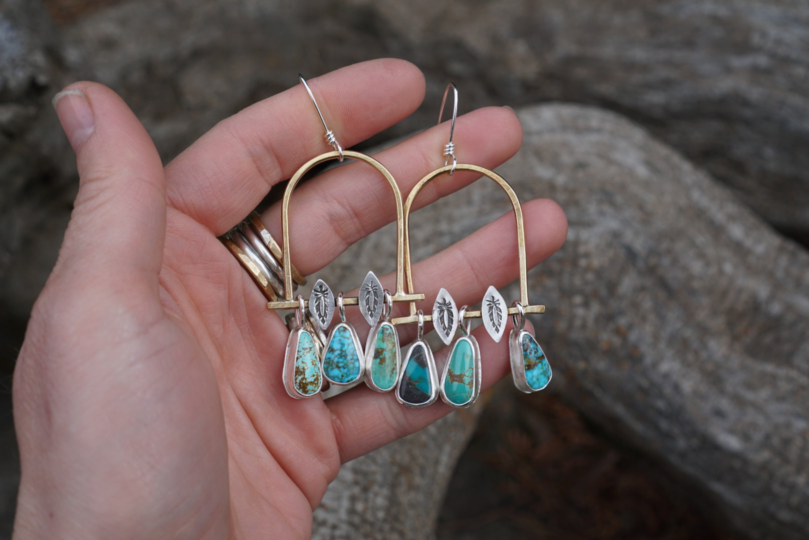 Fun, unique earrings with so much movement! These earrings are truly one of a kind. They feature turquoises in varying shades from two different American mines, Nevada Carico Lake and Arizona Kingman. They dangle at the base of domed shaped brass hoops with hand stamped feather cut outs. The stamps are special because they are handmade by seventh generation Navajo stamp makers. Earrings are finished with hand crafted sterling silver earwires and dangle about 2.75 inches in length.