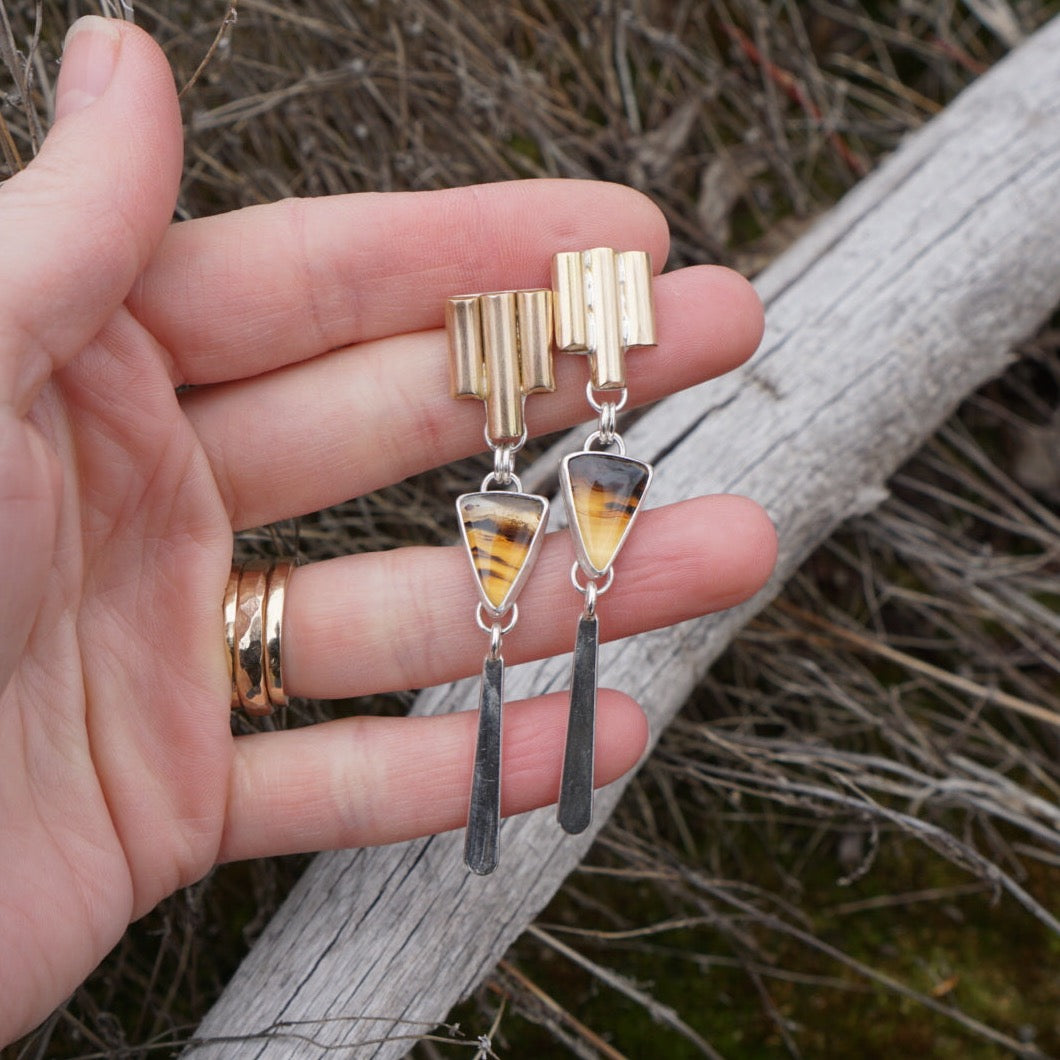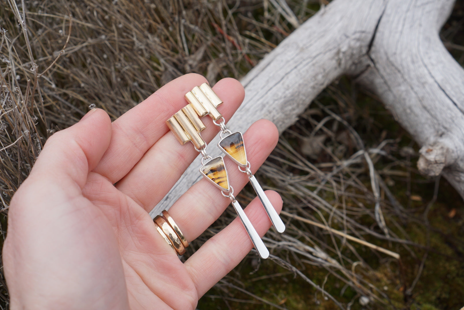 These fun post earrings feature gold fill art deco inspired posts with triangle Montana Agate stones dangling below with sterling silver paddle detail. These are so fun and comfy. Earrings measure about 2.75 inches long and are finished with sterling silver comfort clutch ear nuts.