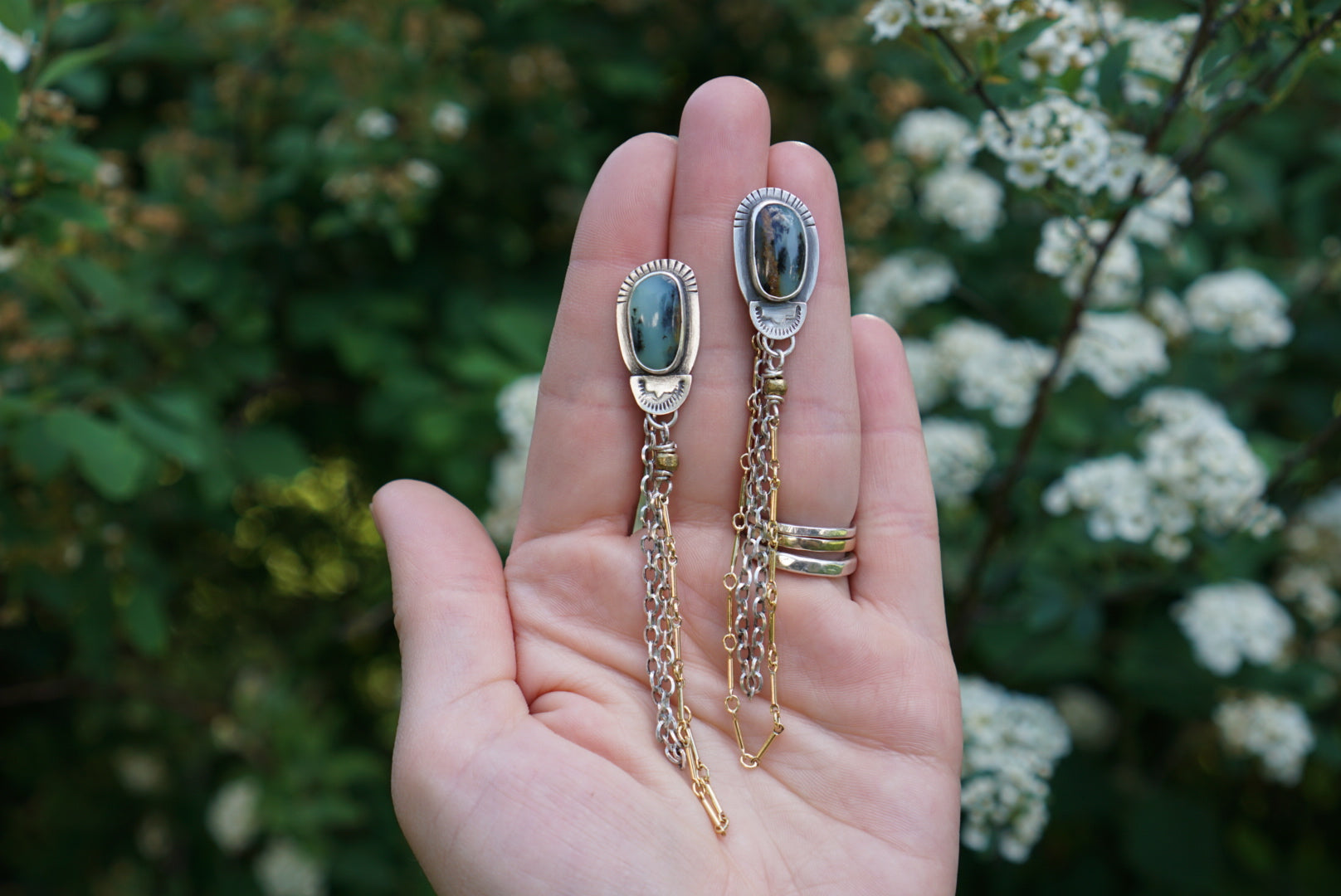 Gorgeous little posts perfect and comfortable for the everyday. Made with fantastic pieces of Blue Opal that are simply set in sterling silver with hand stamped detail at the bottom and sterling and 14kt gold fill chain dangles that loop around to the back earnut to give these an extra interesting look. If you have a second piercing you can also connect the earnut to the back of a different post earring for a different effect. Simple, cute and funky all at once. These measure 3.5 inches from the post to bottom of the chain.