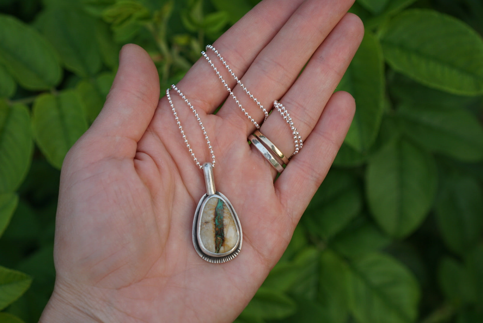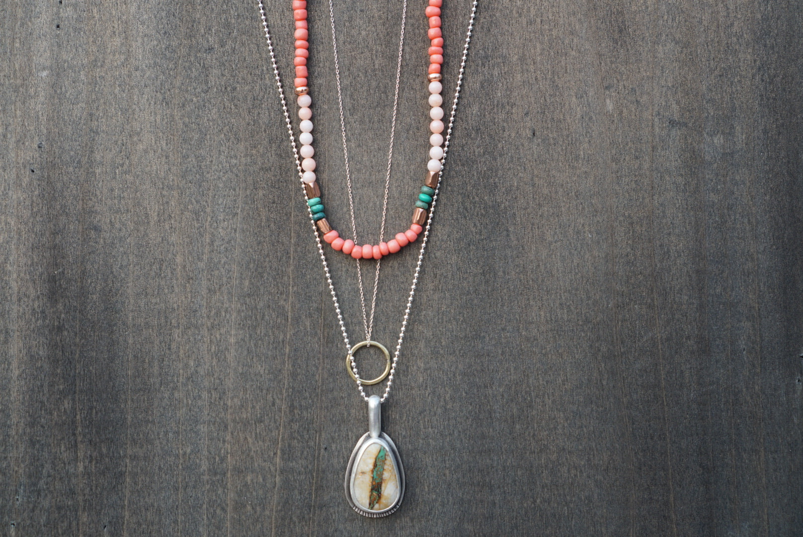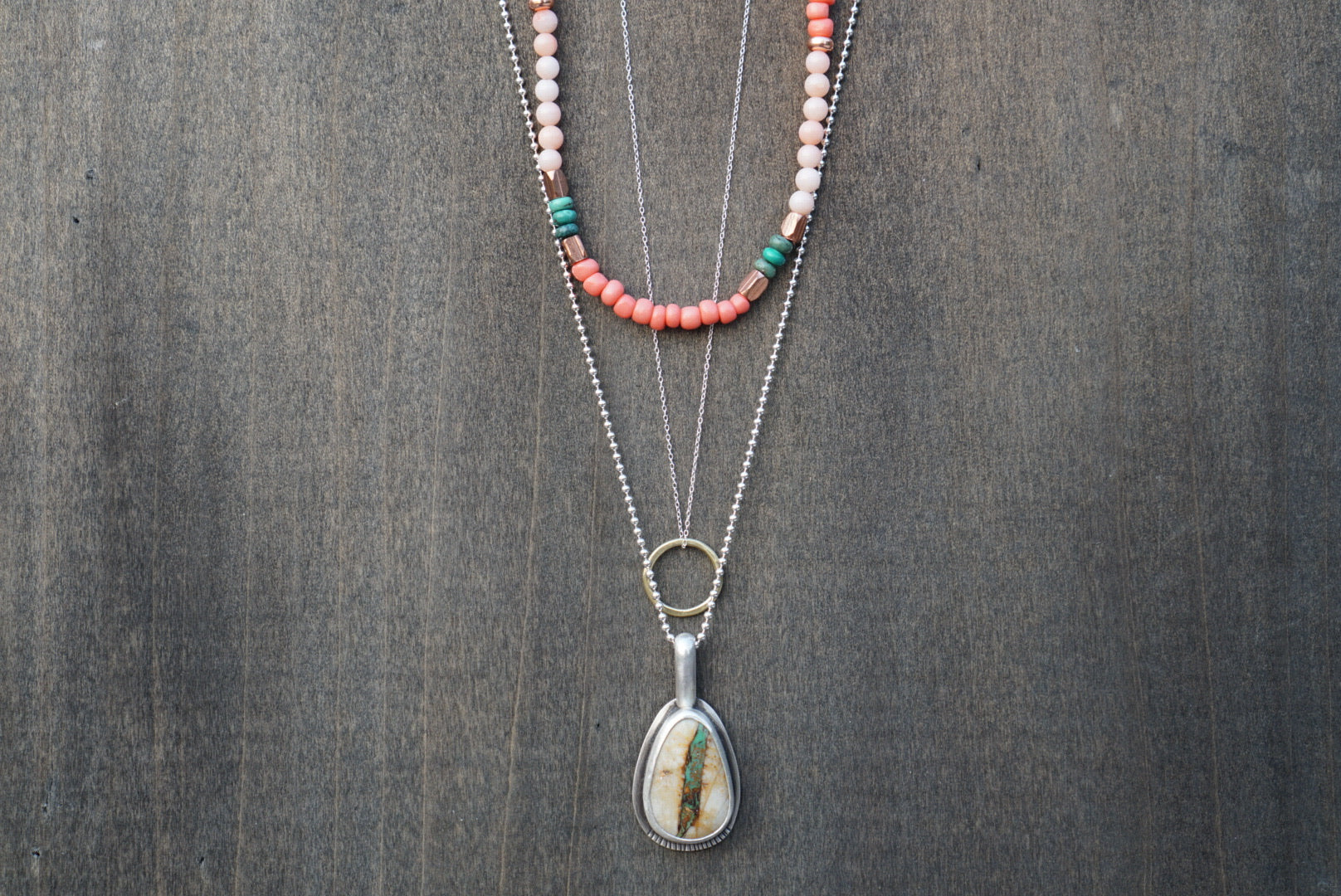 Fun and beautiful necklace set including three necklaces that can be worn layered together or all on their own. This set includes a simple fine and dainty necklace with brass circle charm on an 18 inch delicate chain, a statement pendant made of reclaimed sterling silver and thick sliced Royston Ribbon gemstone on a 22 inch ball chain and a beaded choker strung on silk and made with seed beads, turquoise, pink coral, and copper beads and measures 14 inches with a 2.5 inch extender.