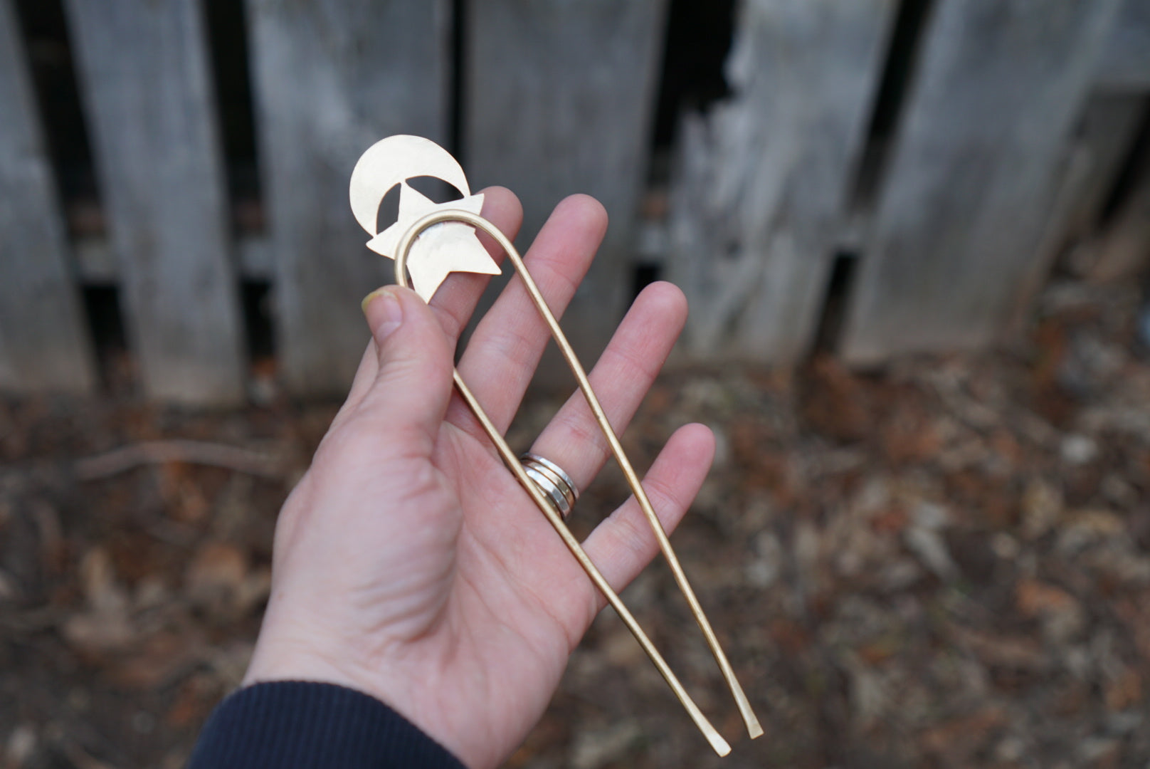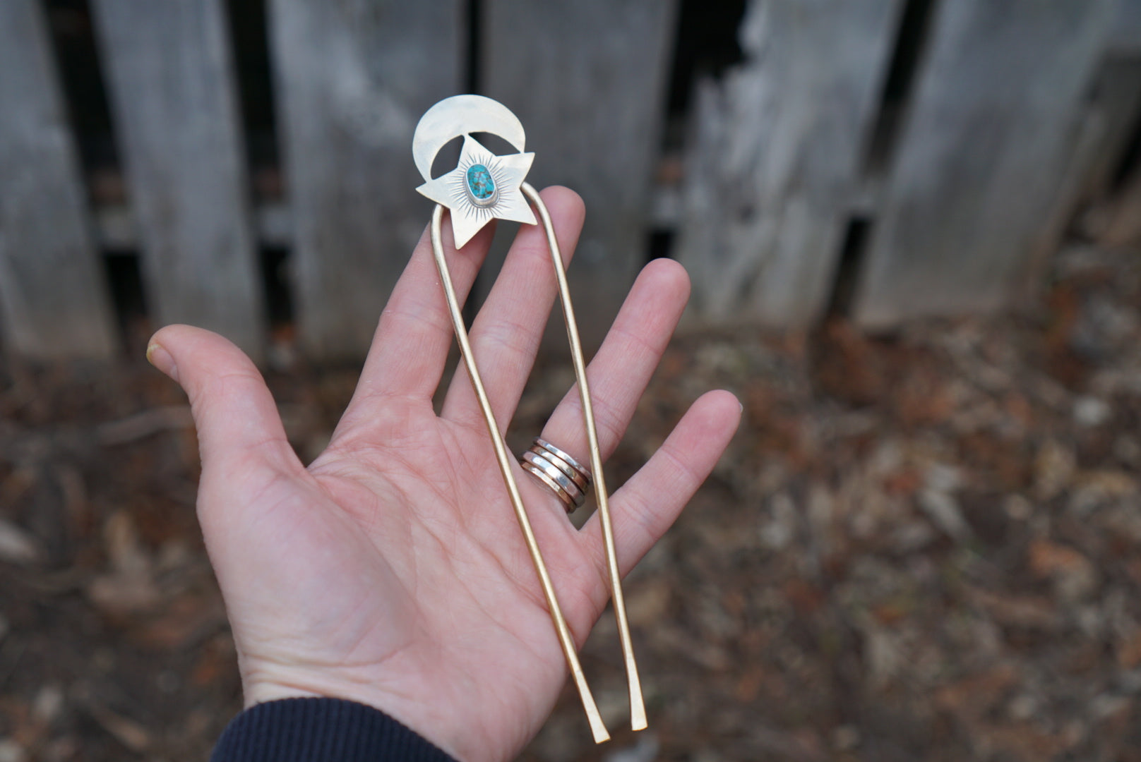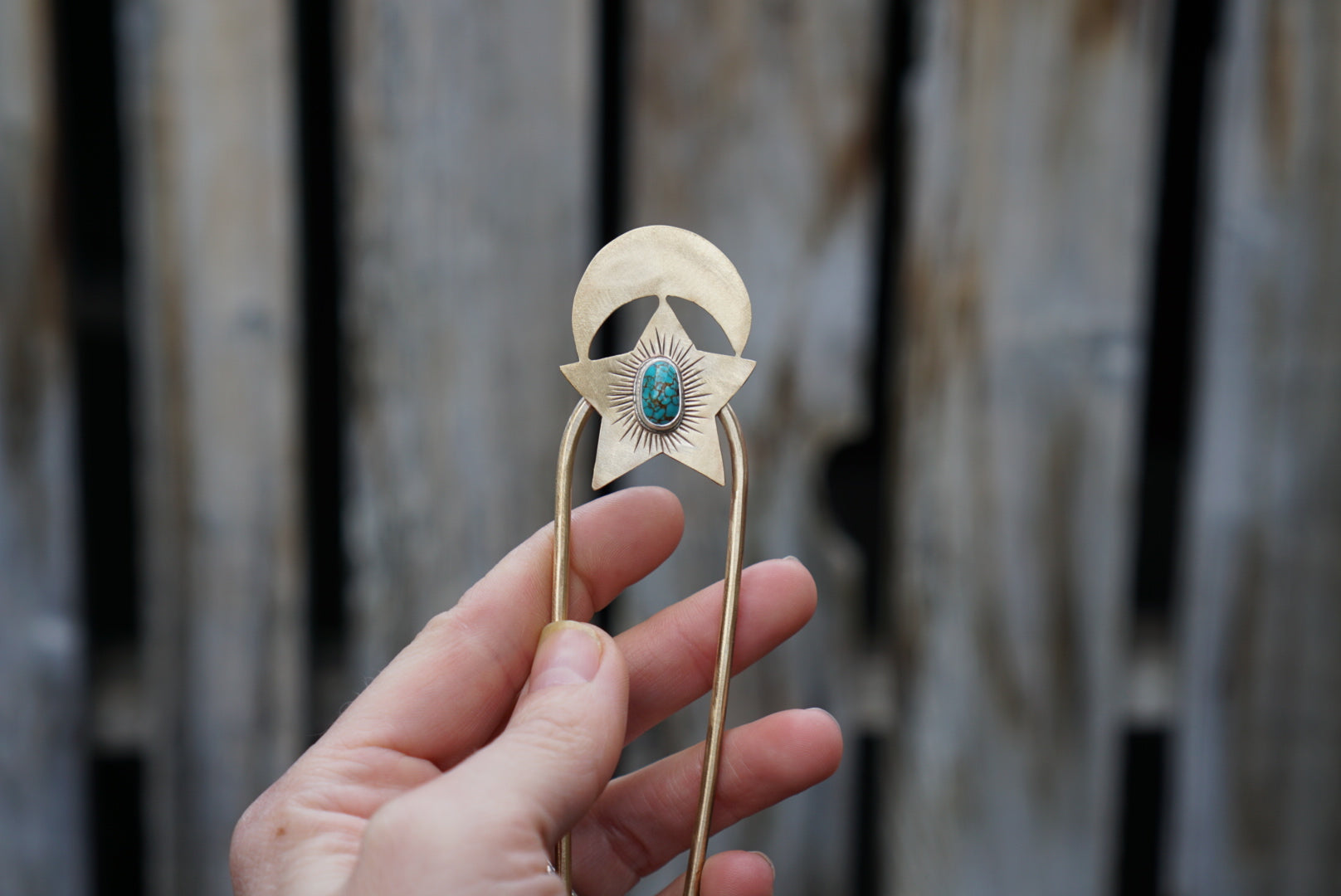A sturdy hair fork made with thick brass prongs and featuring a hand drawn and sawed brass Moon and Star with a little hunk of turquoise in the center. Hairfork is about 6 inches tall.
