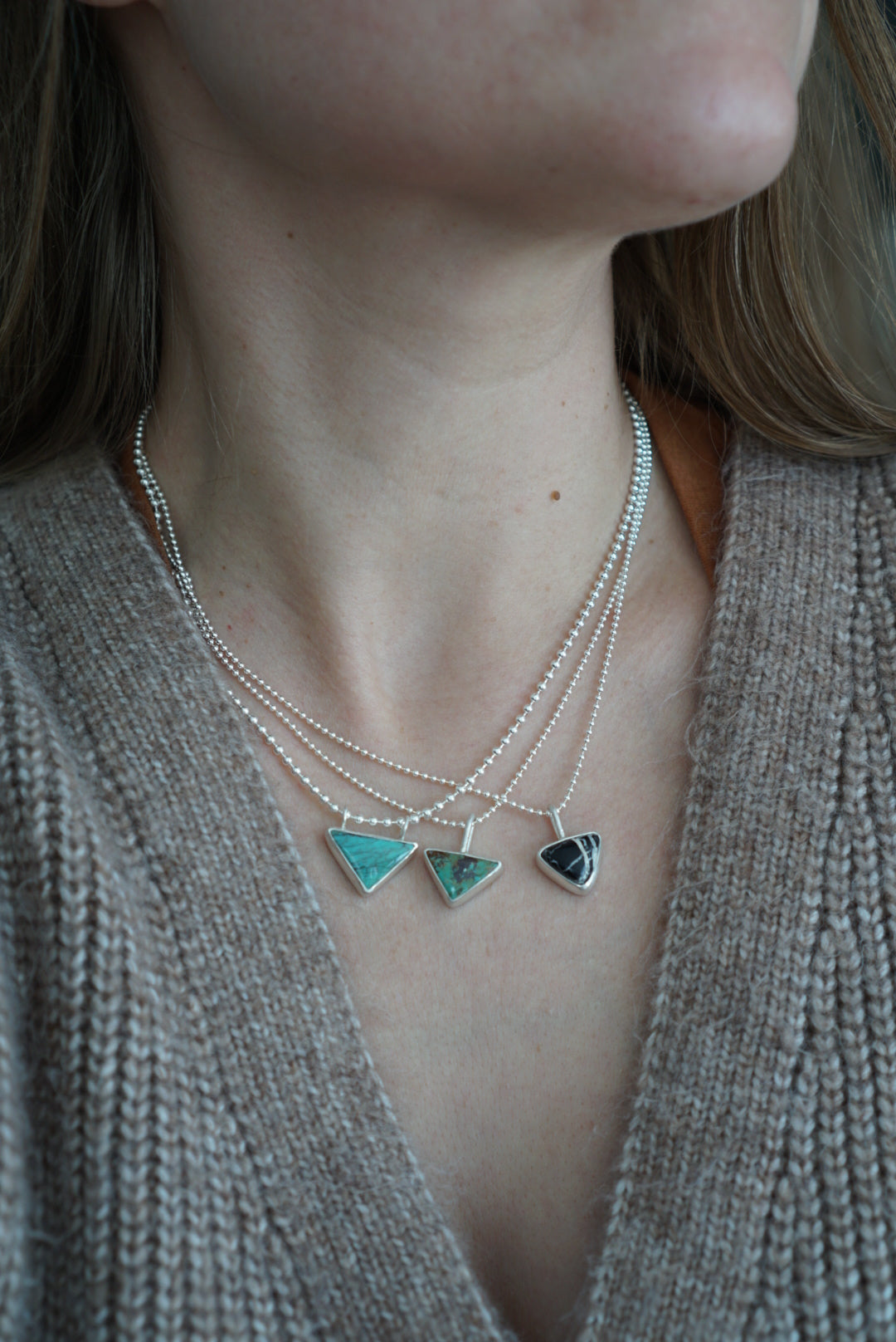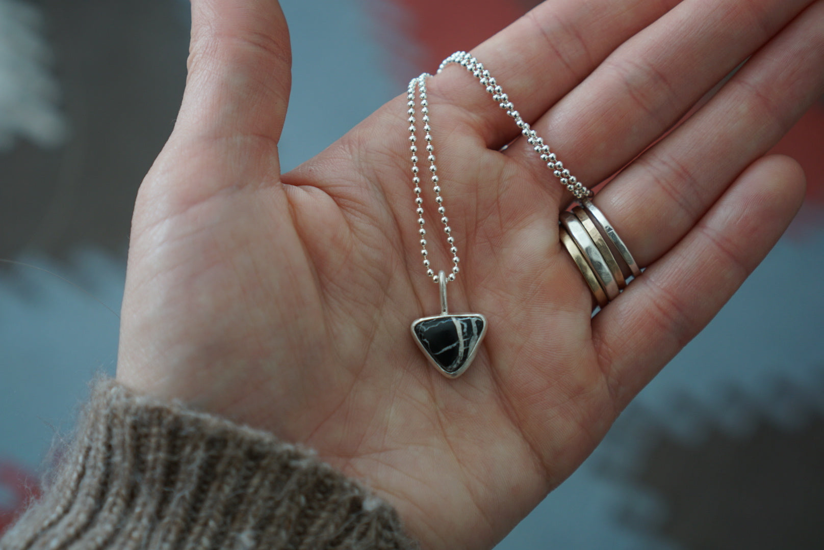 THE best little everyday necklace featuring and gorgeous Triangle shaped hunk of black and white White Buffalo Turquoise wrapped in recycled sterling silver. This necklace is absolutely perfect for everyday wear. Stone is simply set in fine and sterling silver and hangs from a dainty but sturdy 16 inch sterling silver ball chain.
