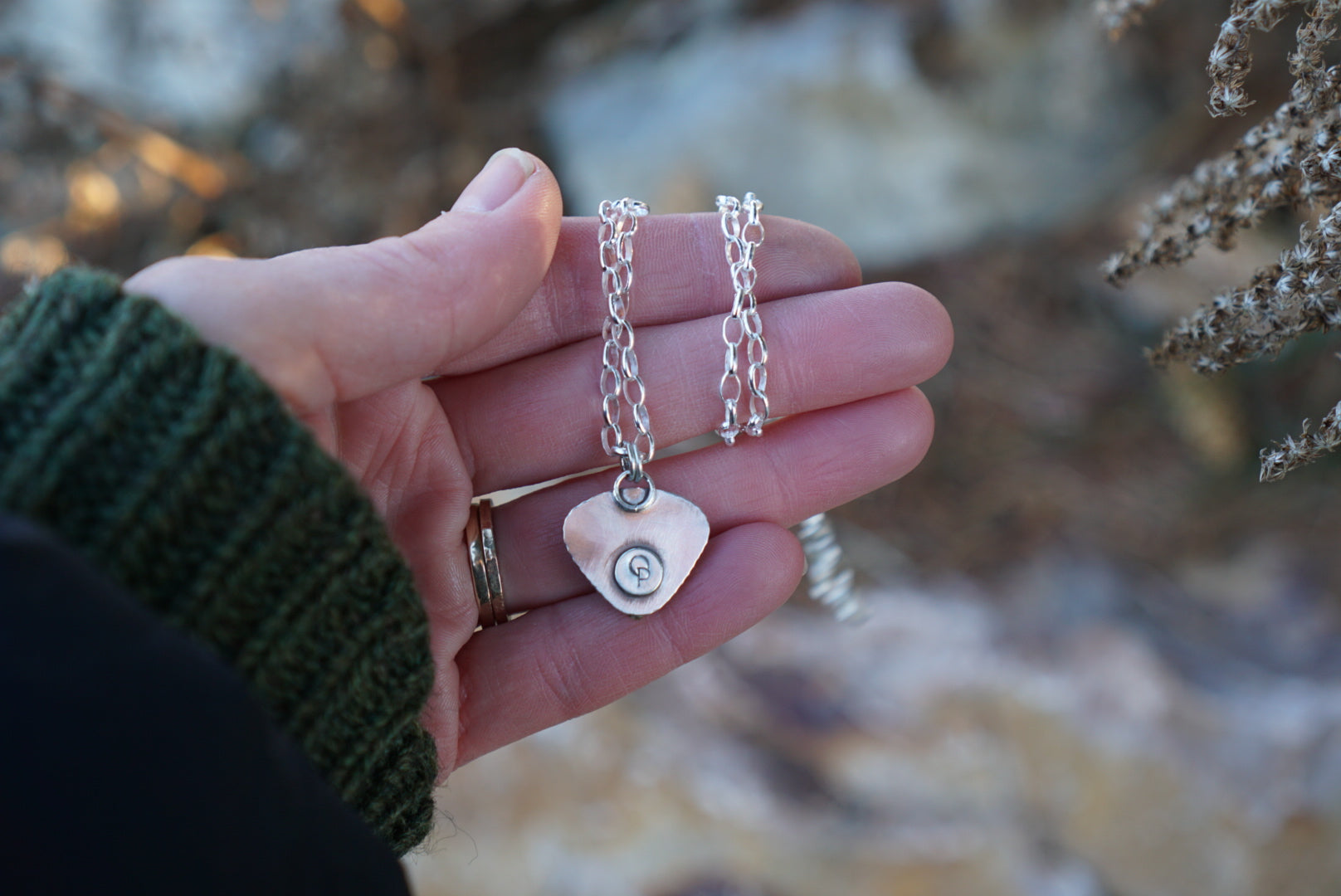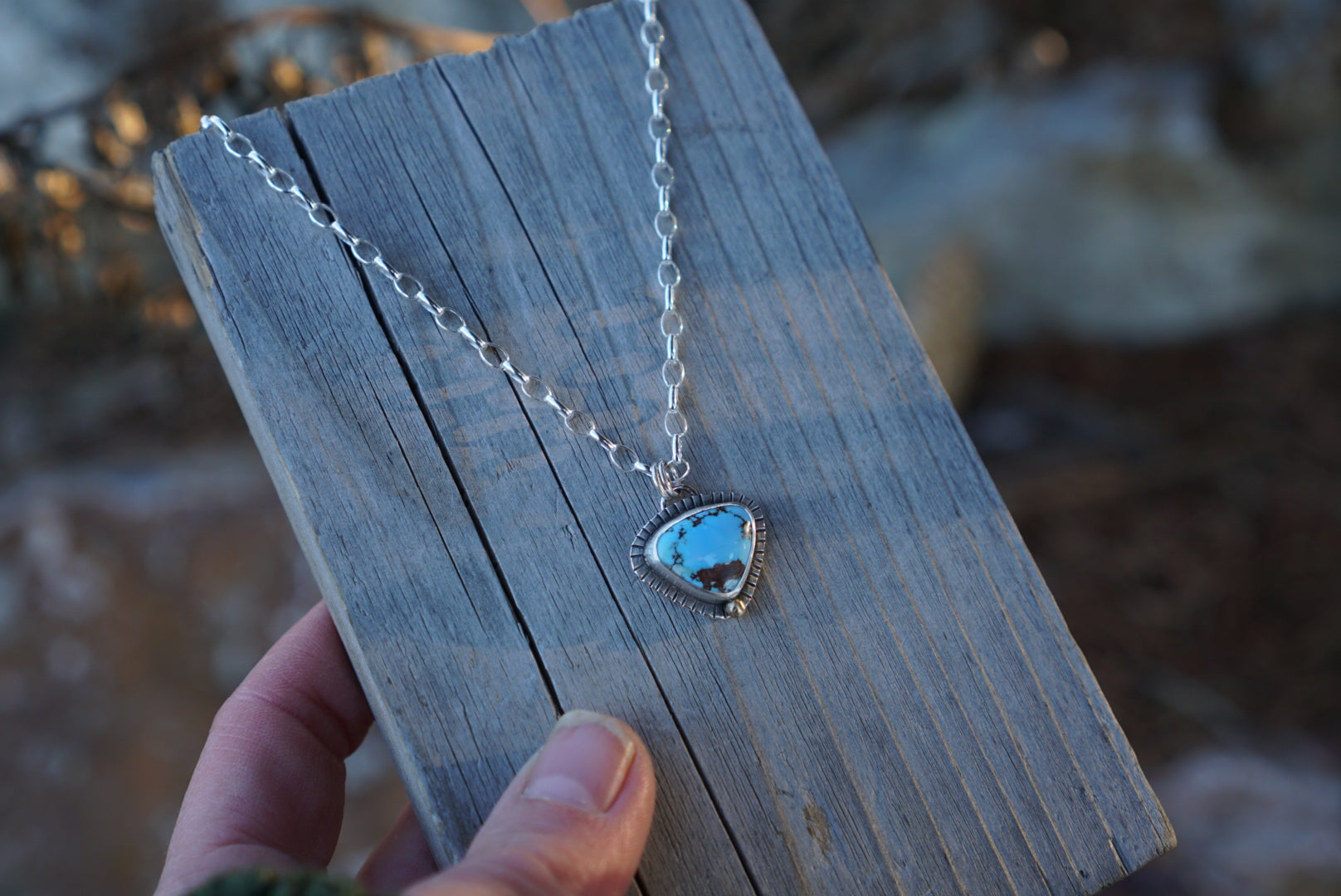 THE best little mixed metal everyday necklace featuring a gorgeous piece of Lavender Golden Hills Turquoise from Nevada. The simplest and loveliest little brass dot bezel setting with hand stamped sunburst detail. This hangs from a sturdy sterling silver oval rolo chain. This necklace is absolutely perfect for everyday wear. Chain measures 16 inches long.