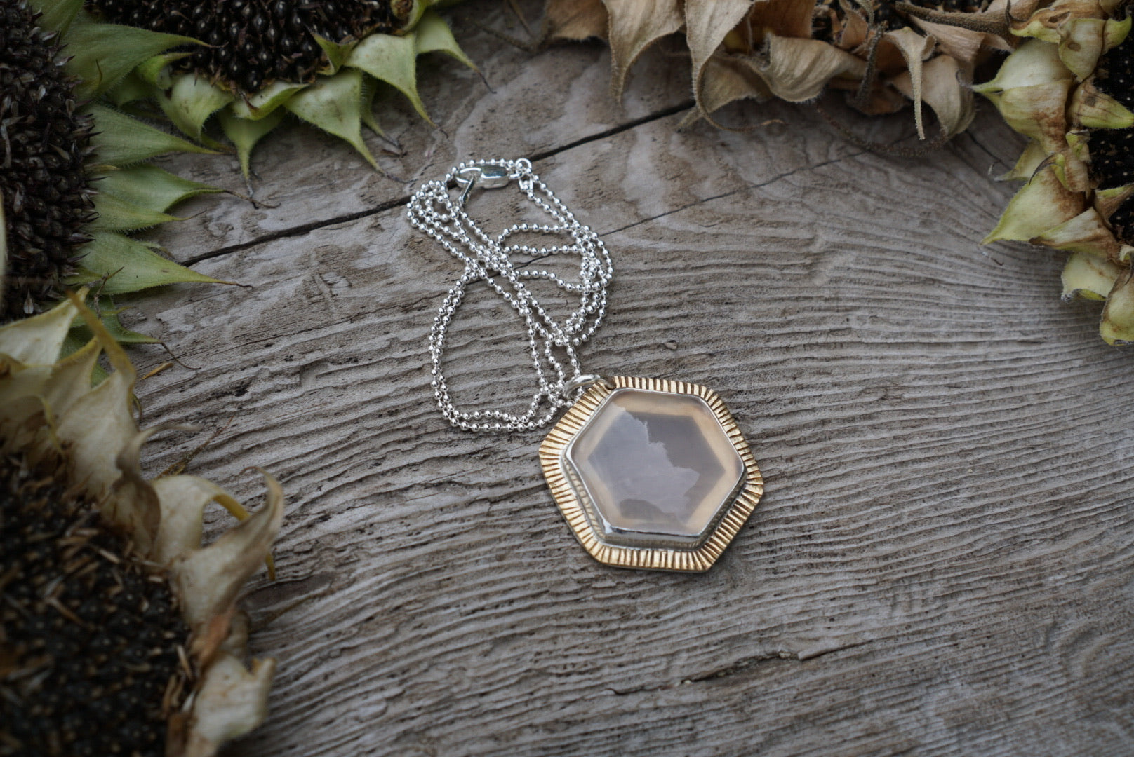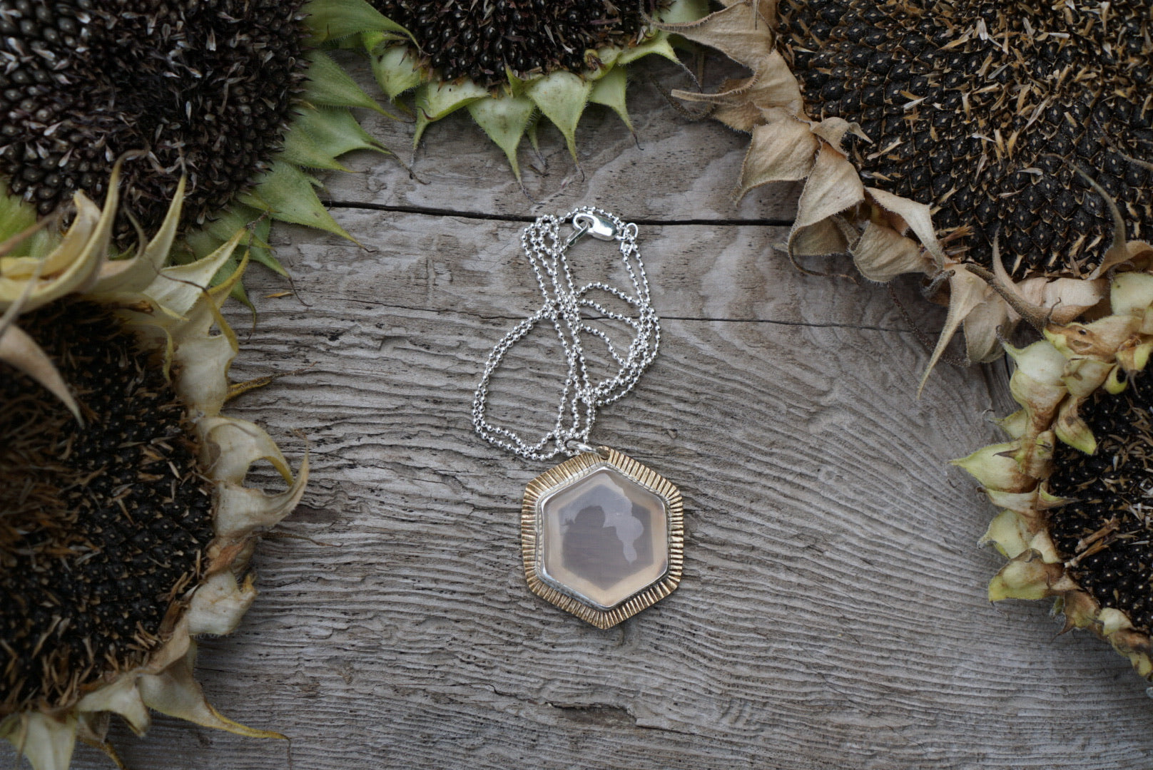 A wonderful little everyday necklace featuring a gorgeous slice of extra light pink Rose Quartz stone in a hexagon shape. Gemstone is set in sterling silver with brass on the outer edge and hand stamped details all the way around, the back is layered with sterling silver and has a cut out so the light cat shine through the stone. Stunning!. This necklace is absolutely perfect for everyday wear. Pendant hangs on an 18 inch sterling silver ball chain.