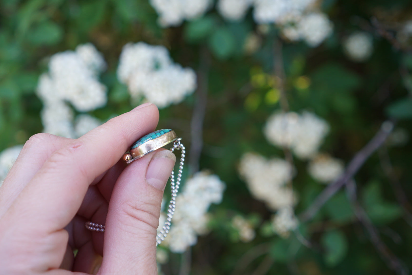 THE best little mixed metal everyday necklace featuring a gorgeous little piece of of dark bluegreen, Otteson Turquoise from Nevada. The simplest and lovliest little dot bezel setting in 14k Gold fill to let the stone shine. This necklace is absolutely perfect for everyday wear. Turquoise pendant hangs from a dainty but sturdy sterling silver 18 inch ball chain.