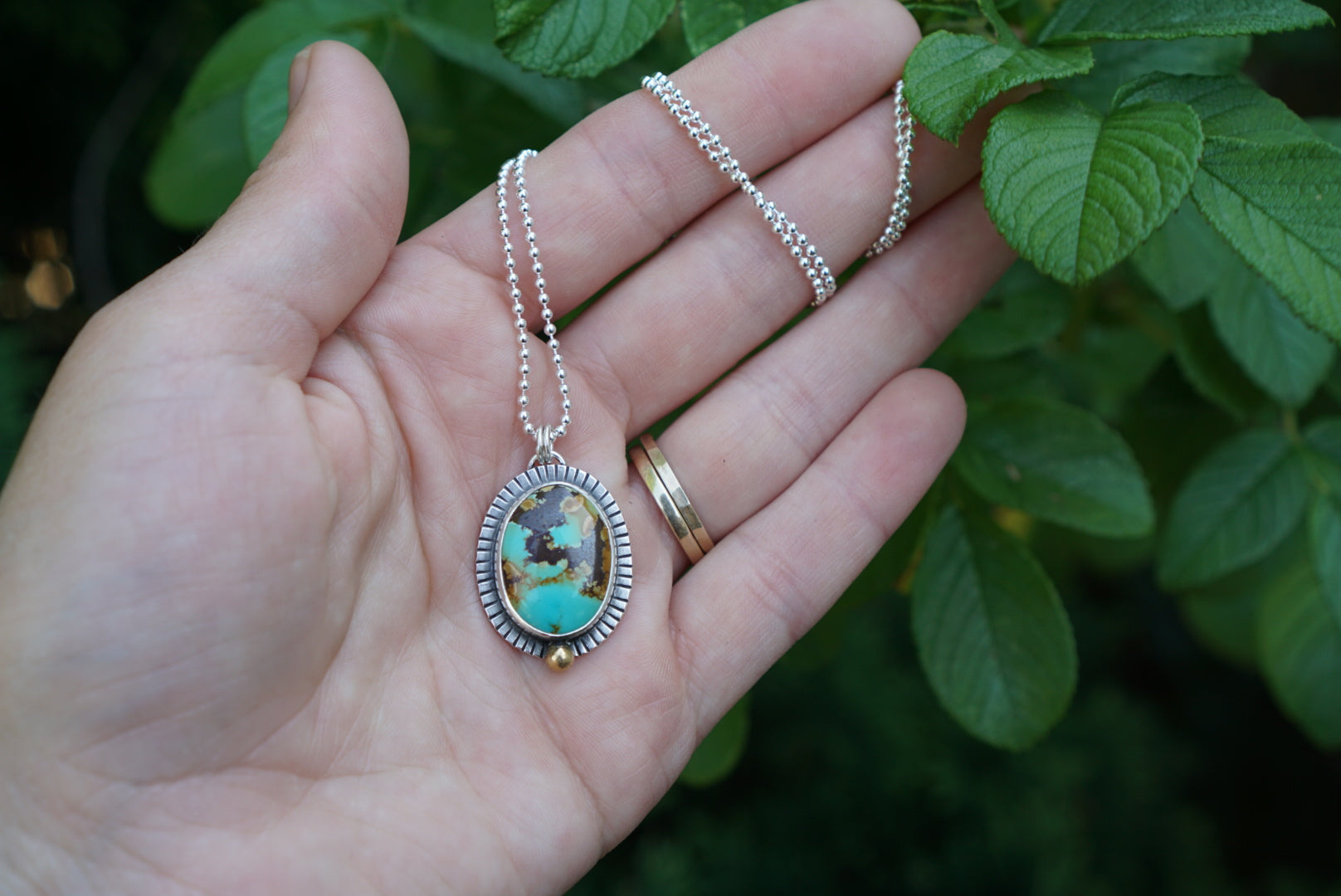THE best everyday necklace featuring and gorgeous slice of Blue Moon Turquoise with sunburst and brass ball details on the setting. This necklace is absolutely perfect for everyday wear. Pendant hangs from a dainty but sturdy 20 inch sterling silver ball chain.