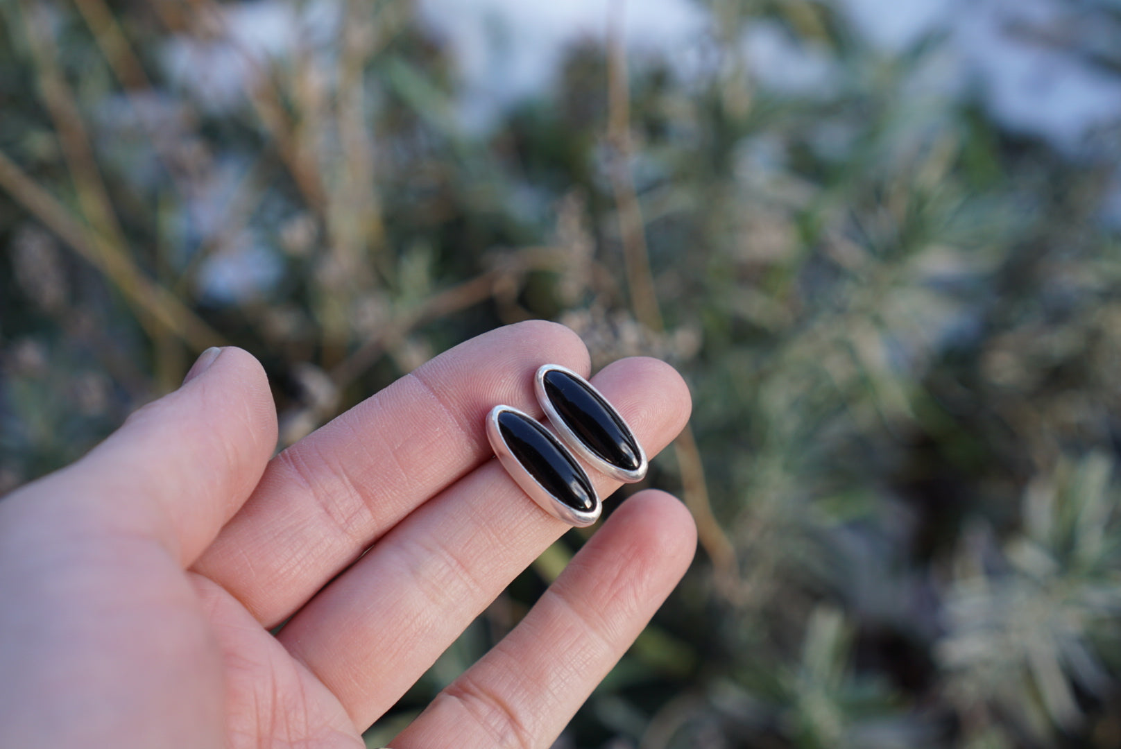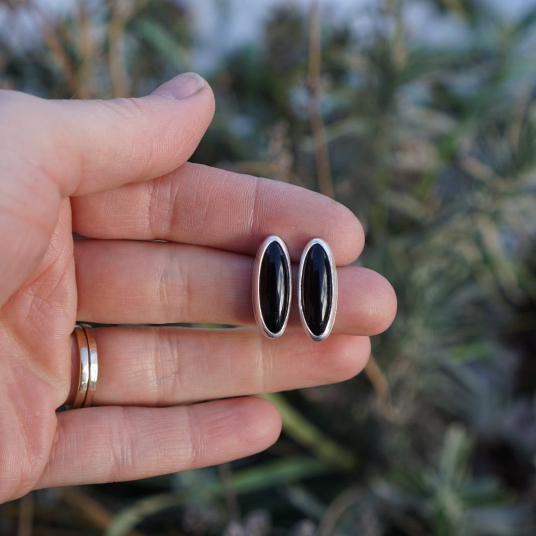 Classic O+P post earrings. Fantastic slices of Black Onyx are simply set in thick Sterling Silver with sterling silver earnest and ear nuts. Earrings are polished for a soft glowing finish and measure about .75 in long.