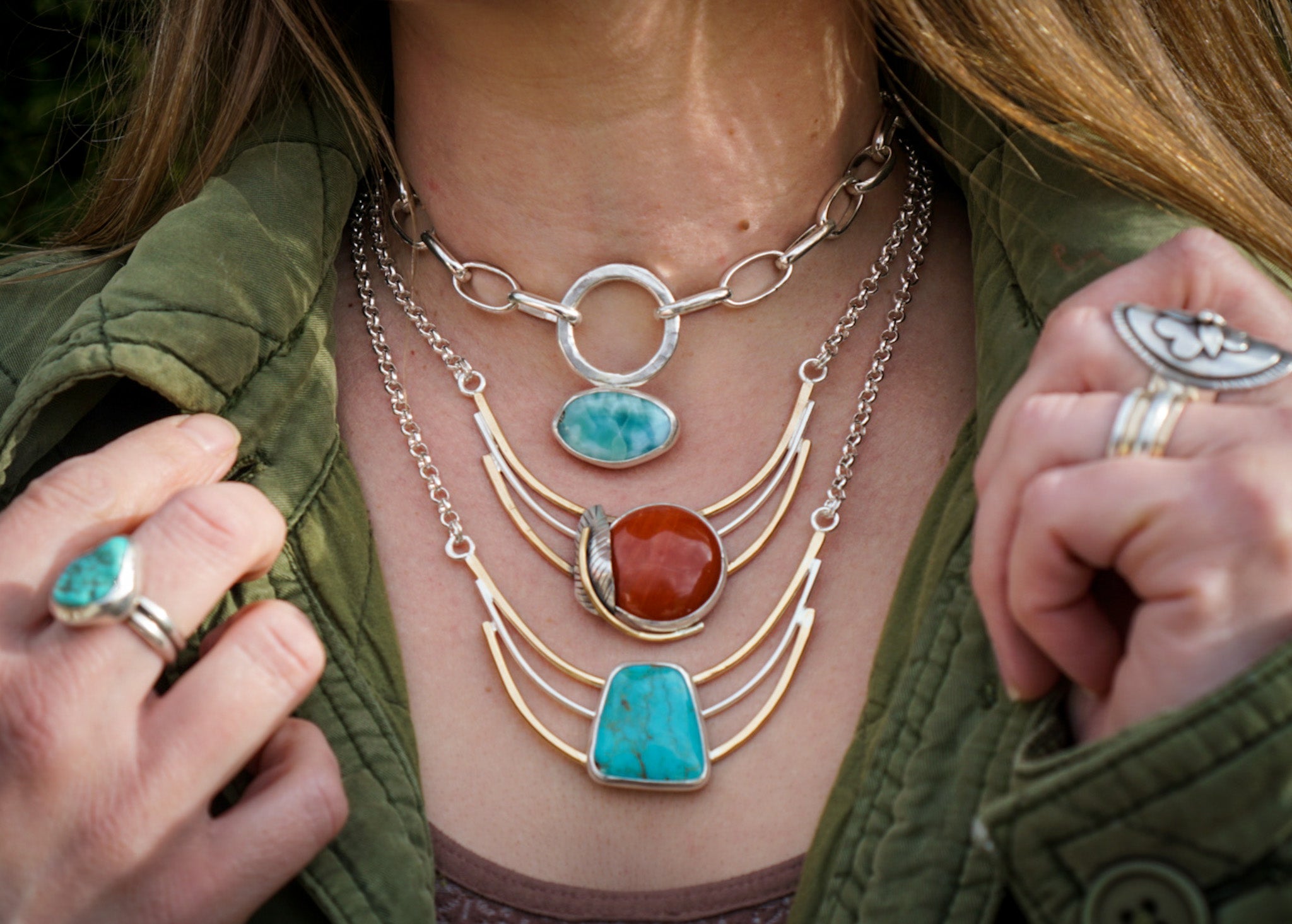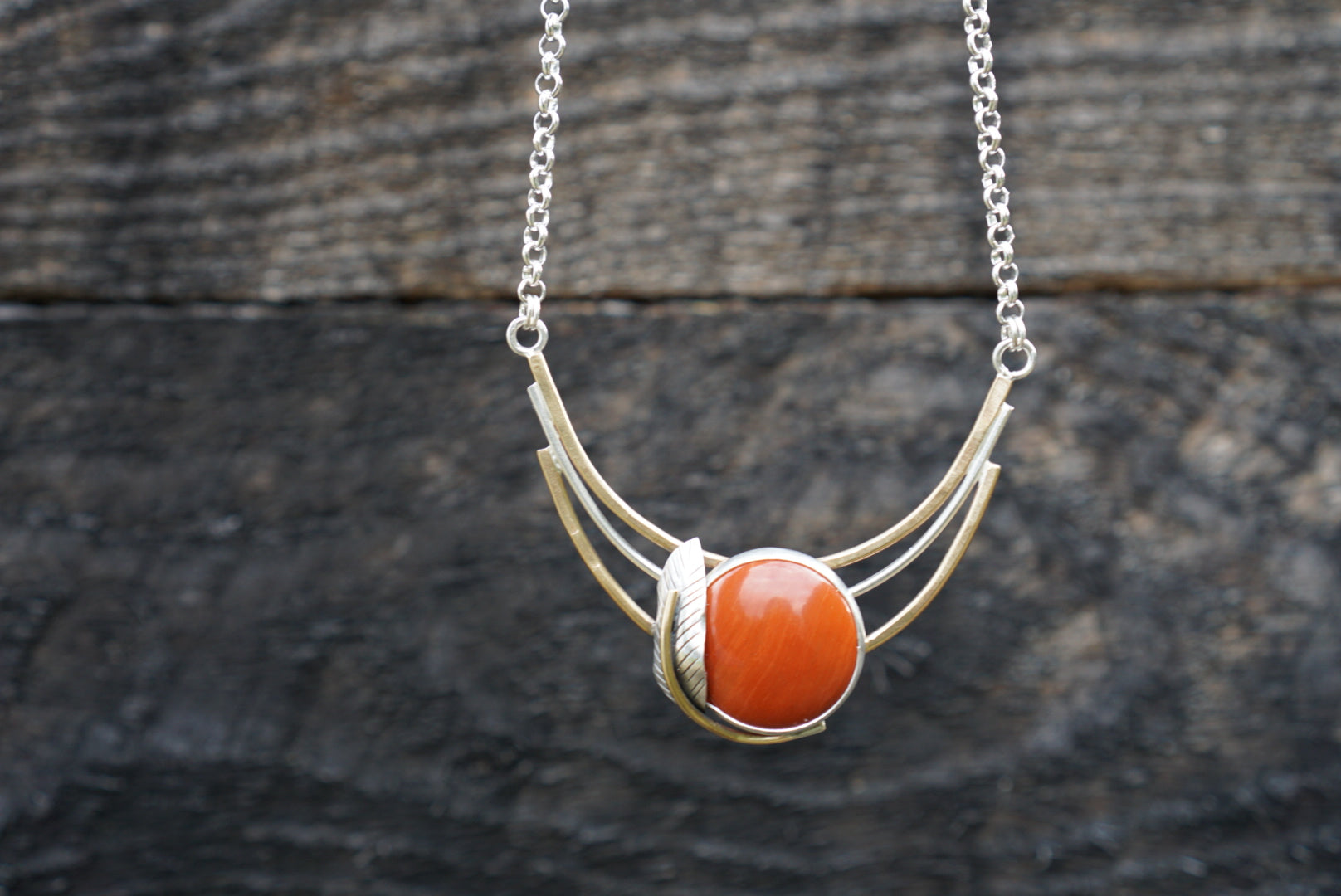 Triple curved bar necklace featuring a stunning piece of Red Jasper mounted in the center with a handcrafted leaf hugging the outer edge. Pendant is made with two red jewelers brass bars and one sterling silver bar, turquoise is set in fine and sterling silver, attached to a sterling silver rolo chain with sterling silver lobster clasp and silver paperclip extender. Necklace measures about 16.5 inches long with a 2.5 inch extender for adjusting.