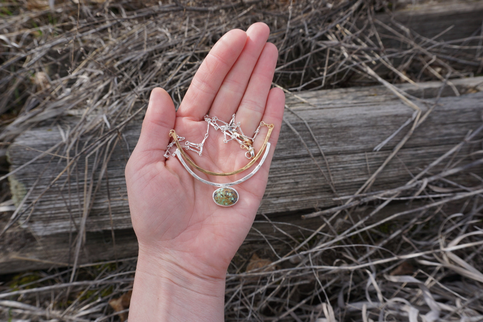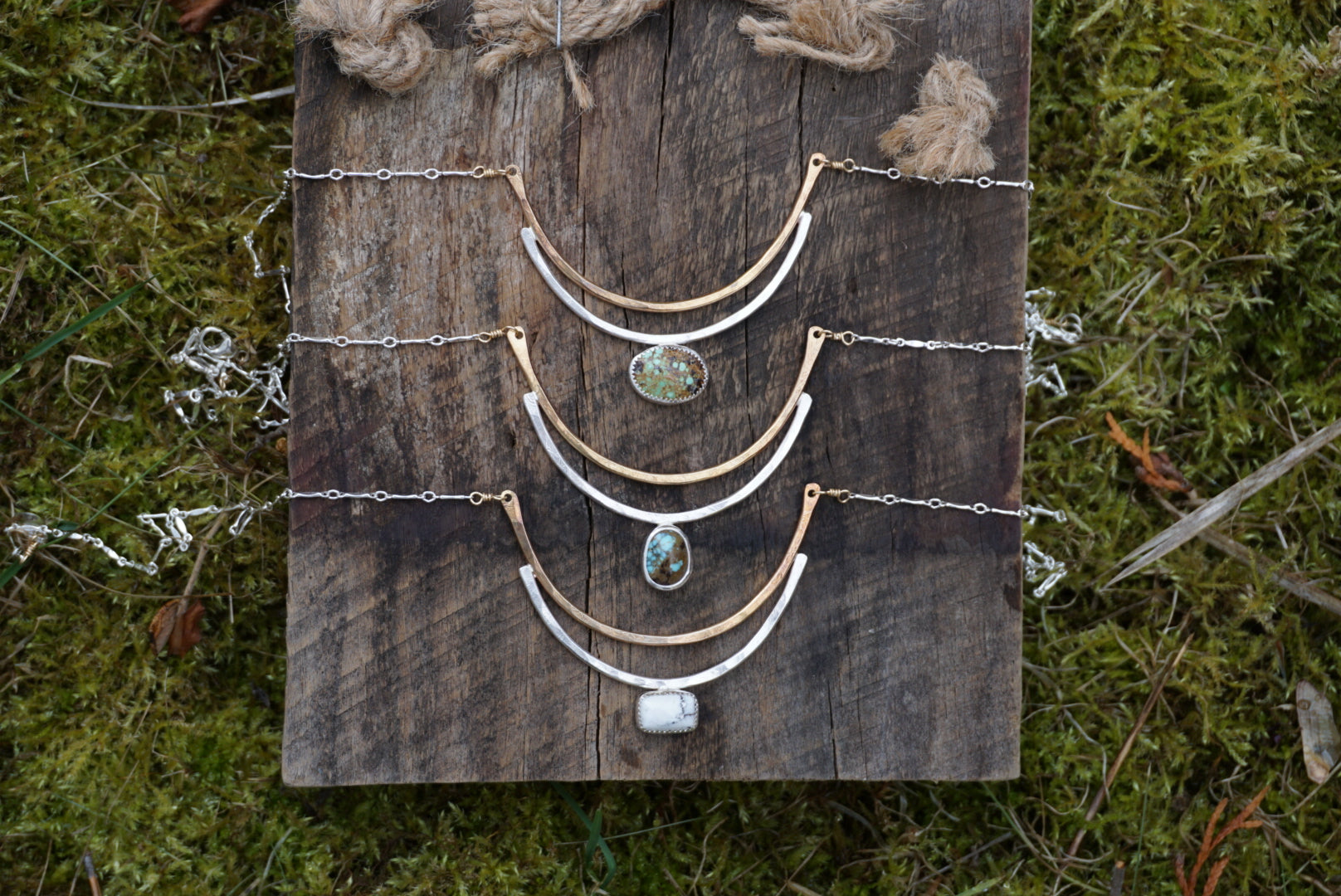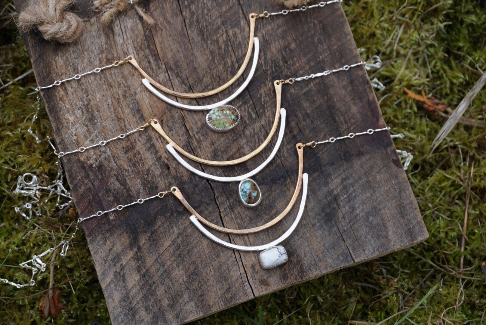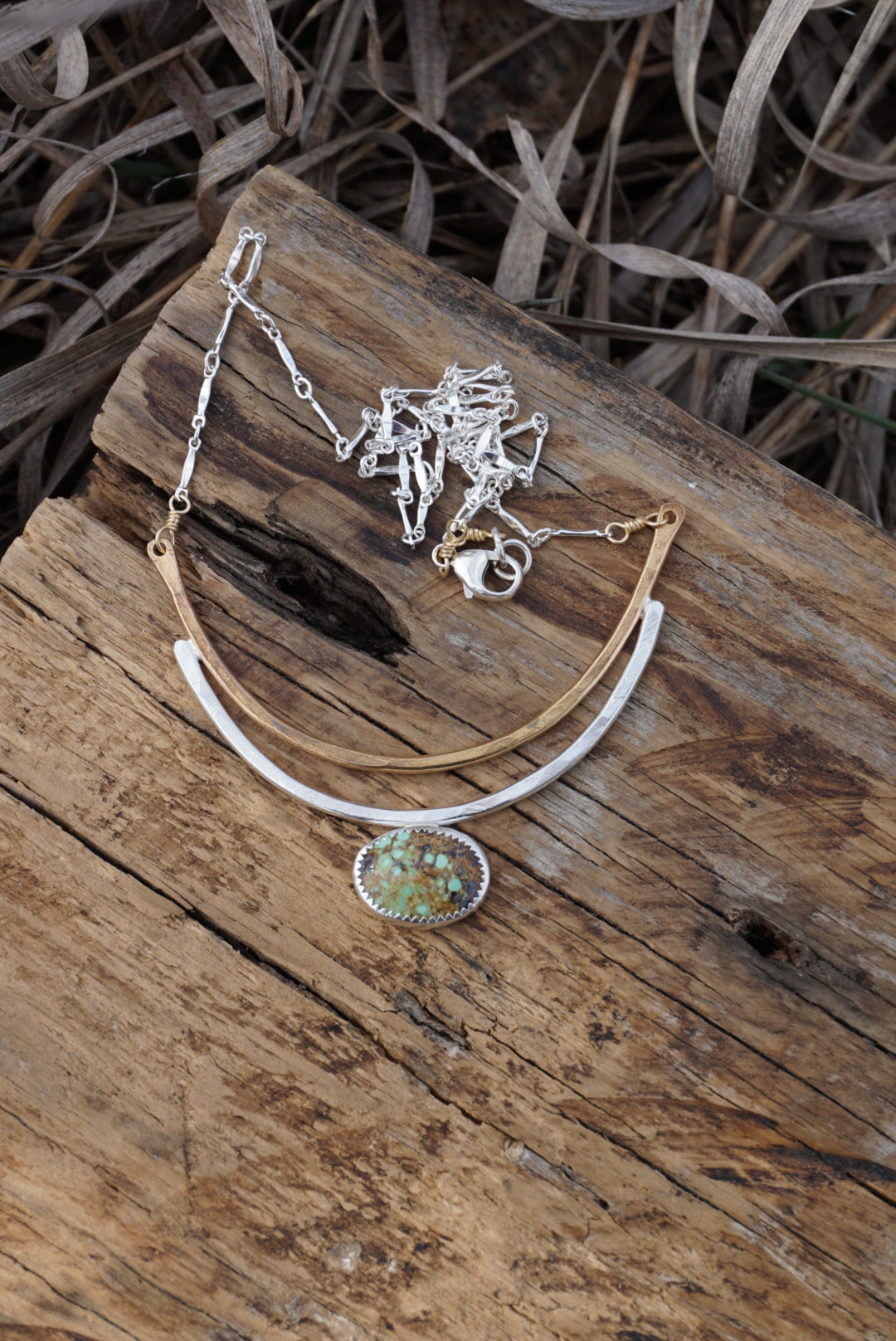 Double curved bar necklace featuring a stunning piece of American mined green matrix Compass Turquoise nestled below. Pendant is made with one red jewelers brass bar and one sterling silver bar, turquoise is set in fine and sterling silver, attached to a sterling silver link chain with sterling silver lobster clasp. Necklace measures about 18.5 inches long.