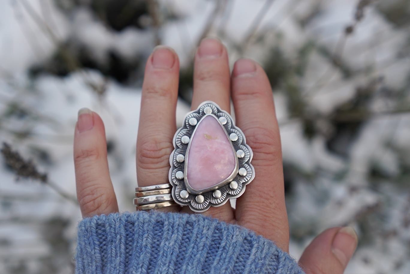 This gorgeous ring is made with a beautiful slice of all natural Peruvian Pink Opal. This stone is natural and has some tiny natural pitting. The stone is nestled inside sterling silver and completed with three which and sturdy layers of sterling silver. This ring was made with so much time and love. Completed with a sturdy split shank ring band and measuring in size 7.75.