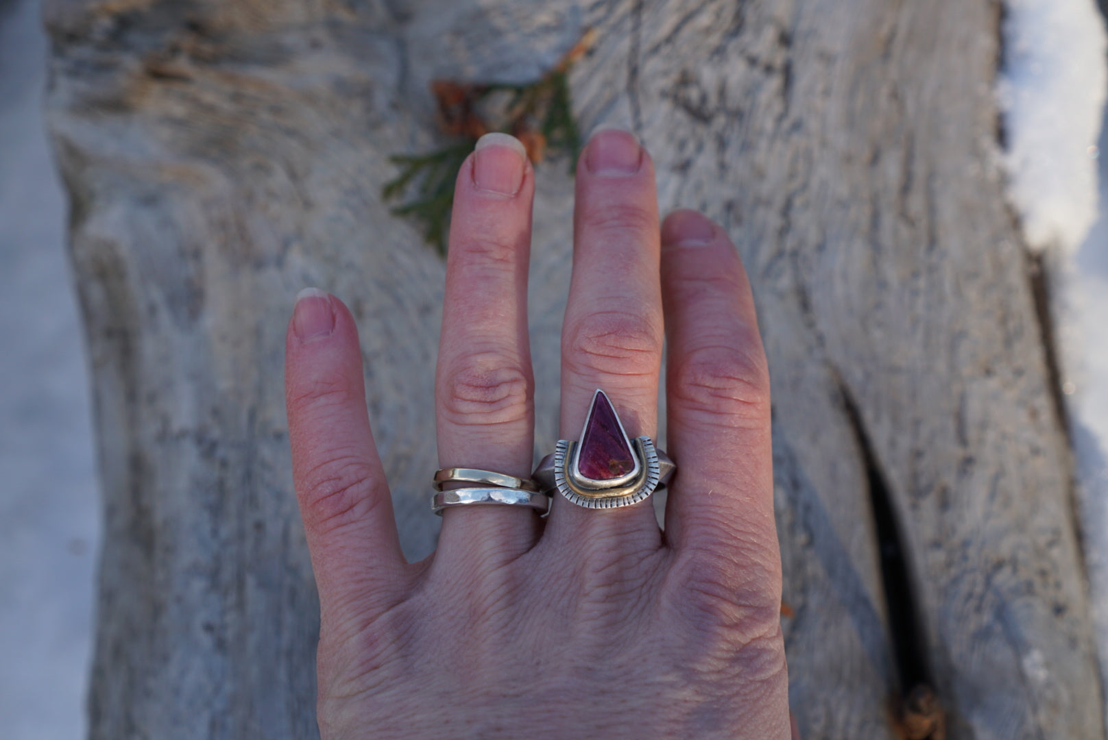 This gorgeous little everyday ring is made with a beautiful teardrop shaped slice of all natural purple/maroon Spiny Oyster Shell. This is a natural shell so small inclusions in the surface are to be expected. The stone is nestled inside sterling silver and completed with a brass loop and sterling silver sunburst detailing at the base. Perched on a unique thick and sturdy triangle ring band and oxidized and polished for a soft rustic finish. This ring best fits a size 9.