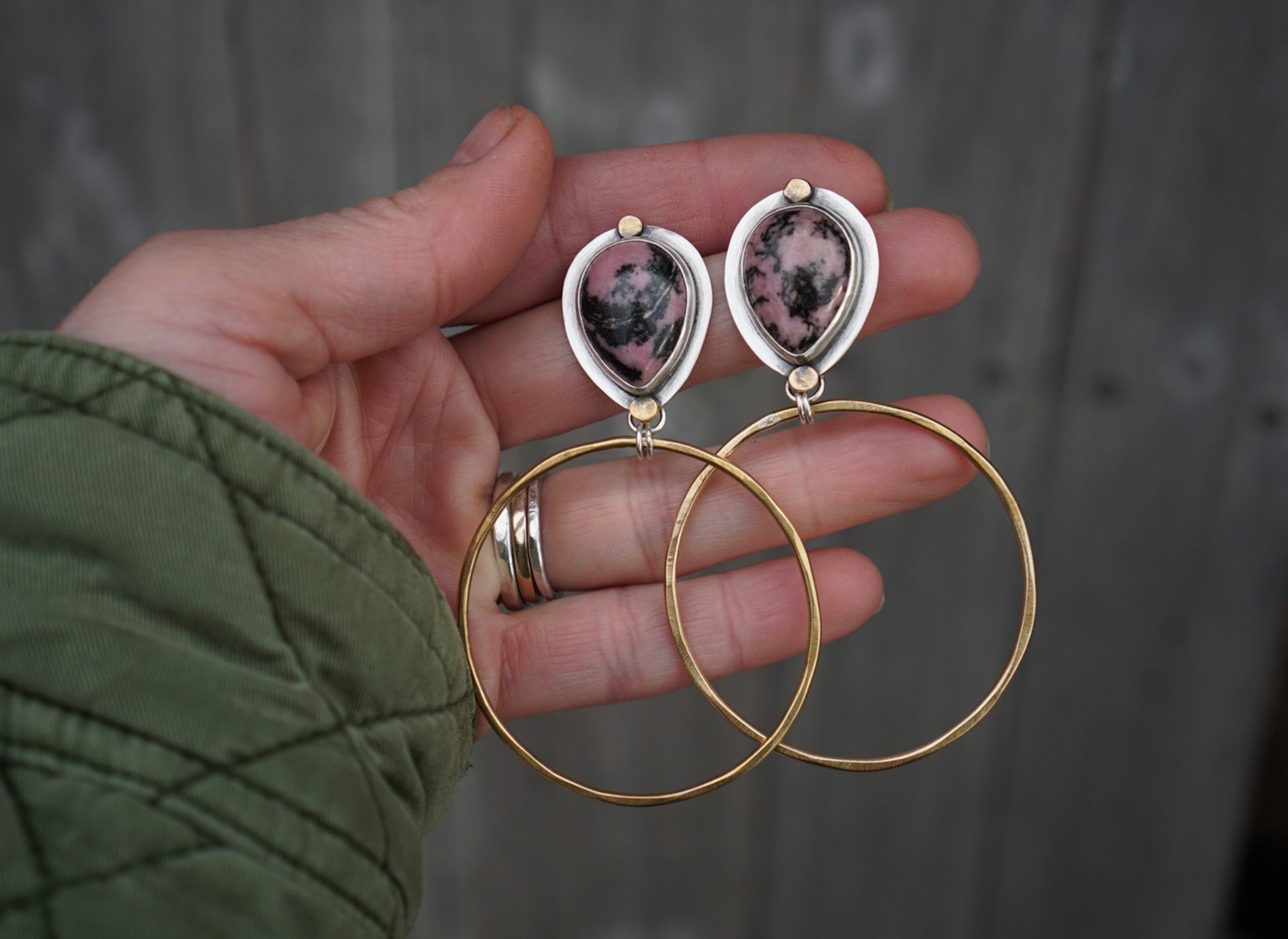 Beautiful all natural pink and black Rhodonite is simply set in sterling silver with brass dot details. Hand formed and hammered brass hoops dangle below. Earrings are unique and comfortable! These measure about 3 inches from the top of the post to the bottom of the hoop. Hoops are about 1.75 inches in diameter. Oxidized for a soft rustic finish and completed with sterling silver comfort earnuts. All handmade, all love.
