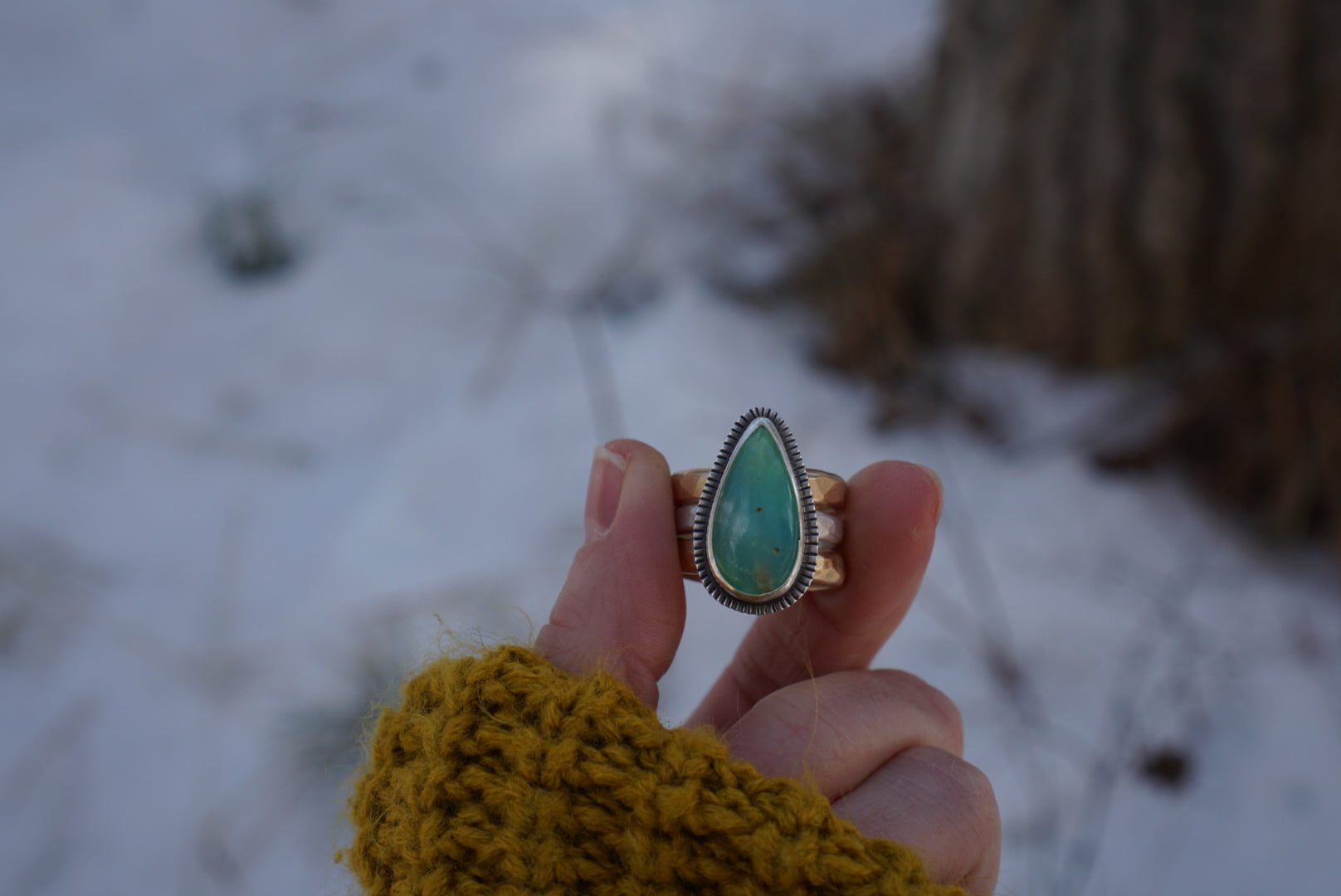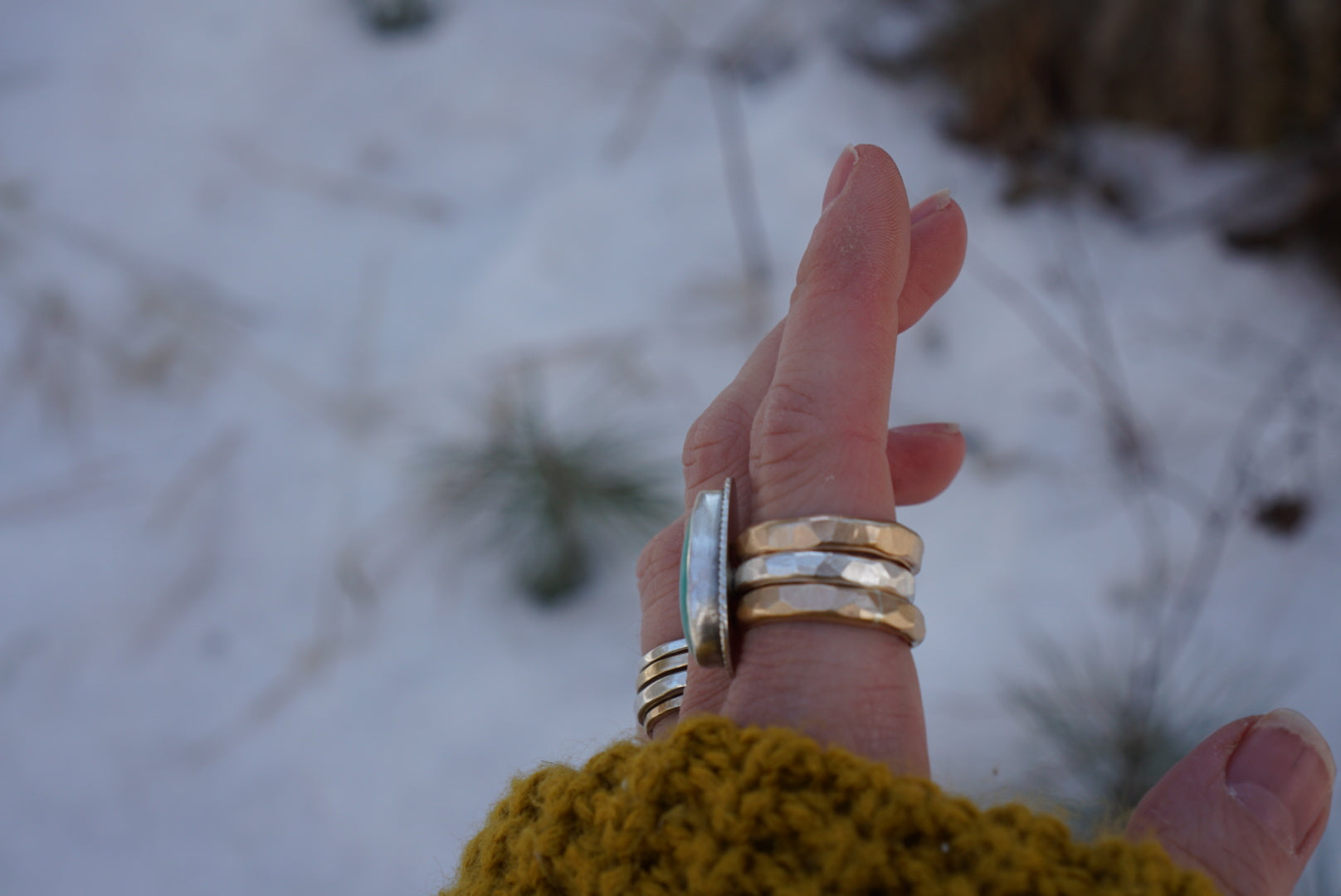 A lovely icy blue green Peruvian Green Opal is set in a simple sunburst setting and perched atop a sturdy hammered ring band and accompanied by two other sturdy hammered 14K Goldfill stacking bands. These rings are the perfect for the everyday and can be worn all together or individually. Polished for a soft shiny finish. Ring set best fits a size 8-8.25.