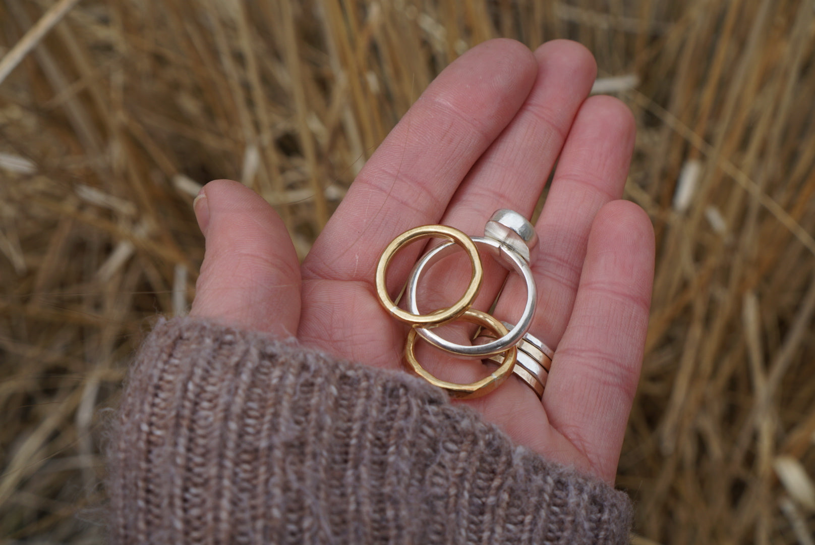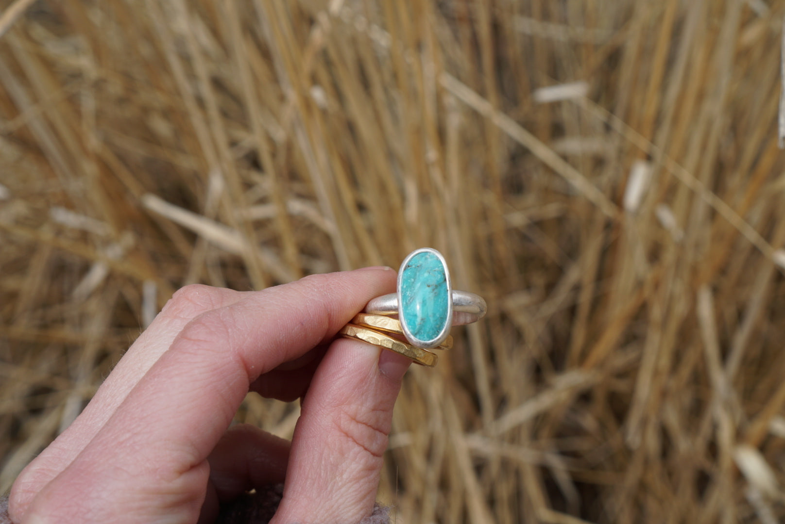 A lovely piece of American Mined Turquoise is set in a simple setting and perched atop a simple and sturdy half round ring band and accompanied by two other sturdy hammered jewelers brass stacking bands. These rings are the perfect for the everyday and can be worn all together or individually. Polished for a soft shiny finish. Ring set best fits a size 9.5-10.
