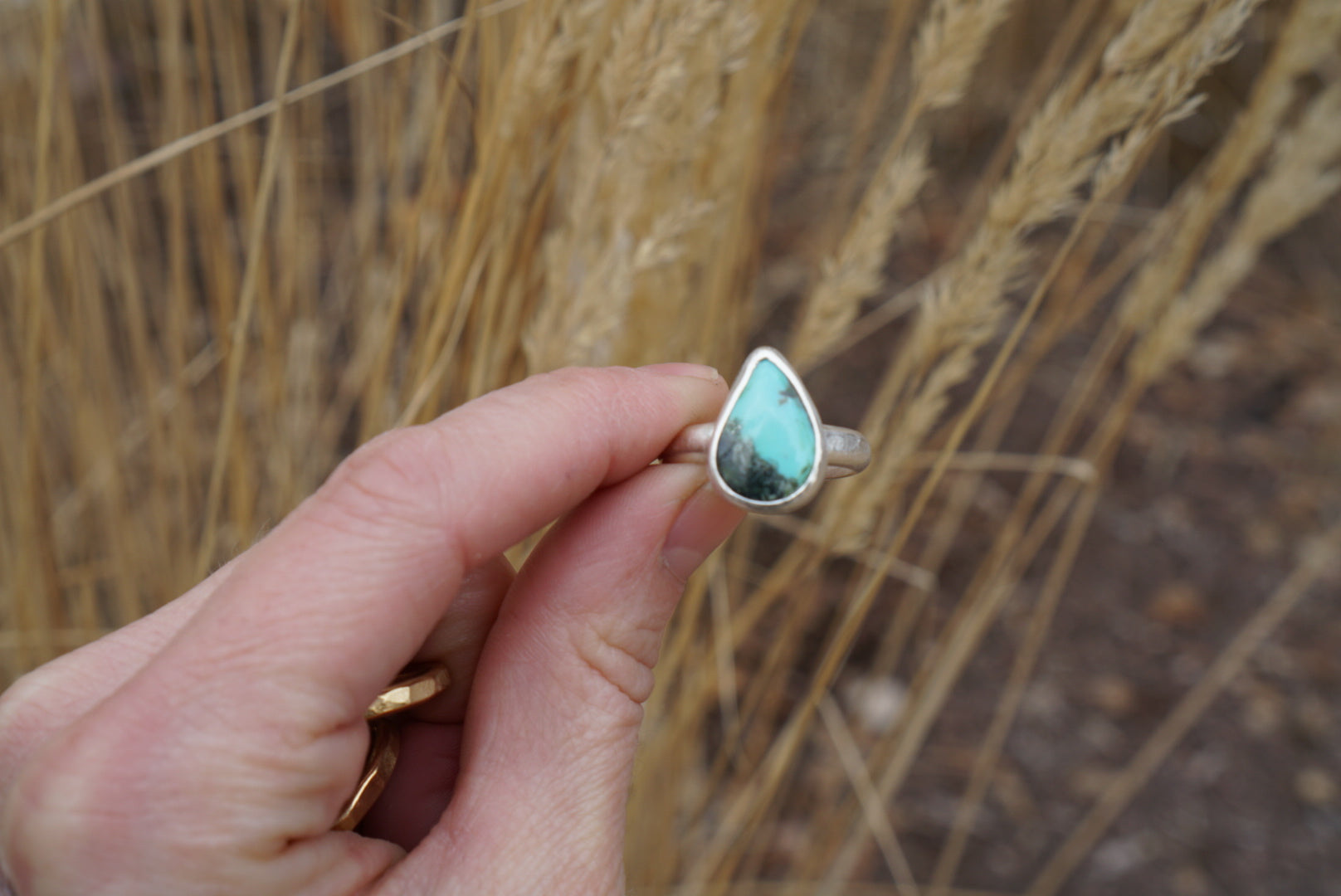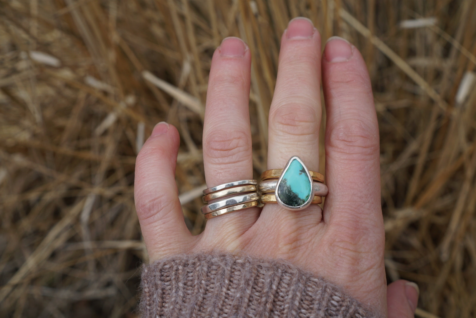 A lovely piece of American Mined Turquoise is set in a simple setting and perched atop a simple and sturdy half round ring band and accompanied by two other sturdy hammered jewelers brass stacking bands. These rings are the perfect for the everyday and can be worn all together or individually. Polished for a soft shiny finish. Ring set best fits a size 8.25-8.5