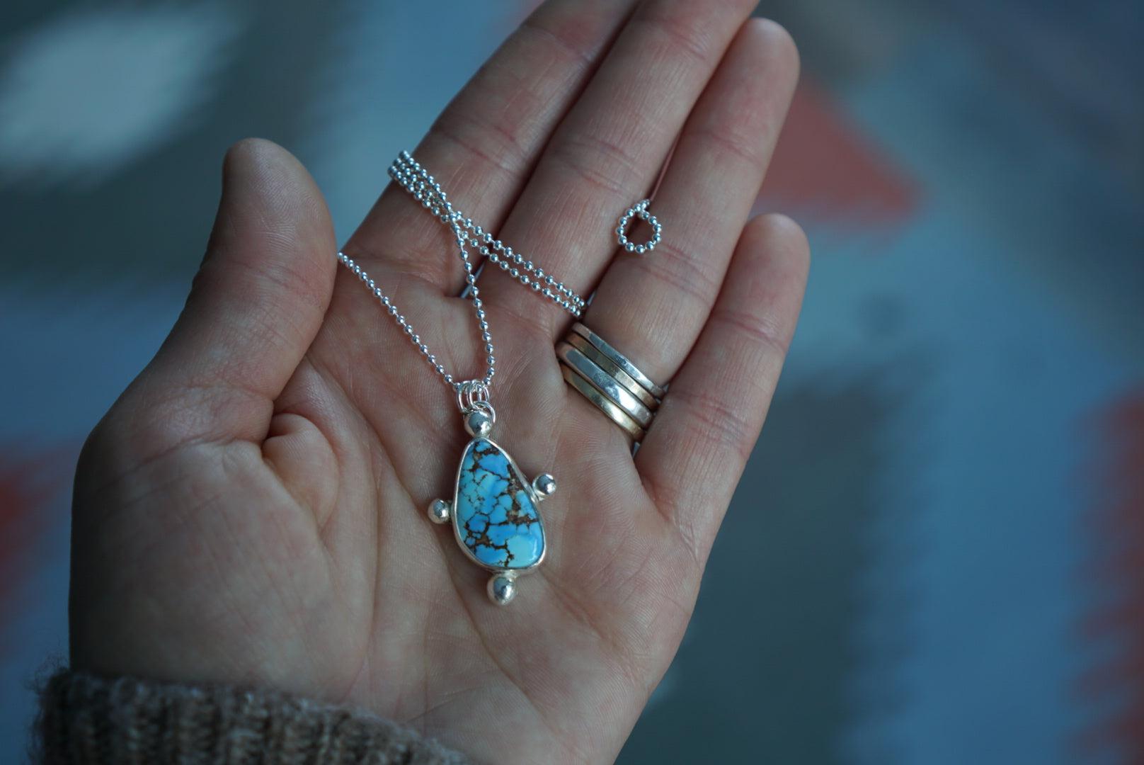 A Gorgeous pendant necklace made with a lovely webbed chunk of Golden Hill Lavender Turquoise. Sterling silver ball details at each cardinal direction point. Finished with an 18 inch sterling silver ball chain.