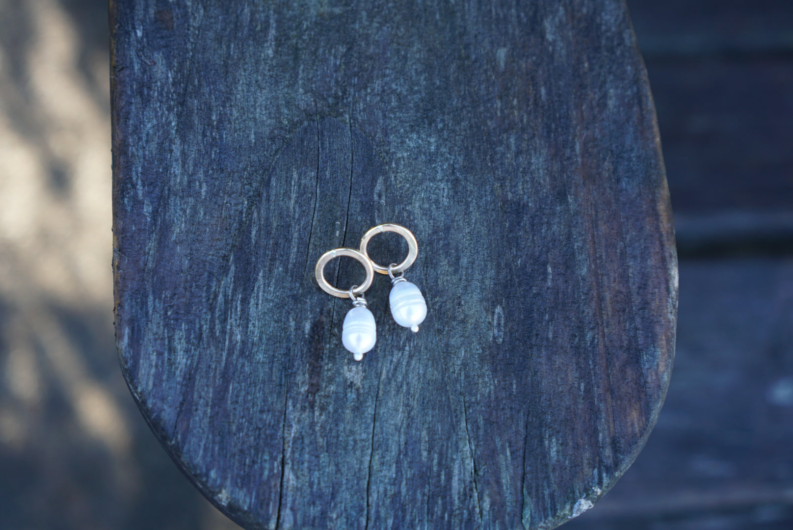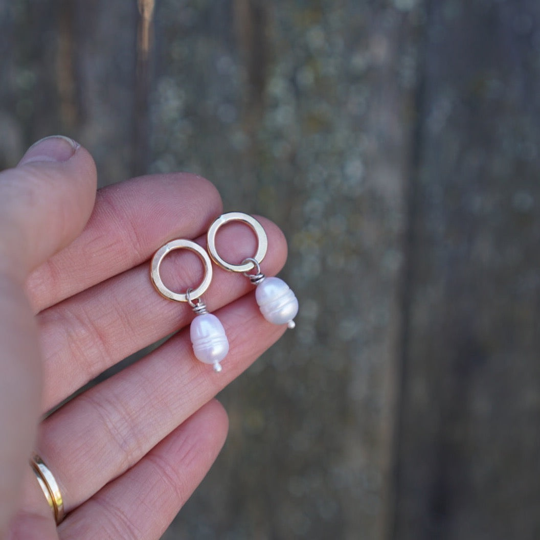 Made to Order, please allow 2-5 weeks for fabrications and shipping. Perfect everyday 14k gold fill and freshwater pearl circular post earrings. Super light weight. Finished with sterling silver earnuts. These measure just about 1 inche long.
