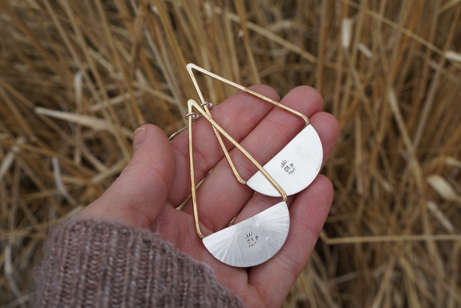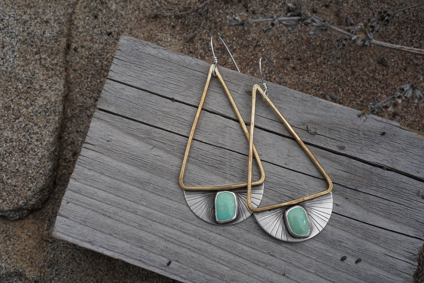 Hand shaped and hammered brass triangles with hand cut sterling silver half moons along the bottom. Each half moon has hand-stamped sunburst detailing and has Green Turquoise gemstones nestled in the center. These earrings are lightweight and comfortable, and the mixed metals keep them versatile to mix and match with other jewelry. Perfect for the everyday. These babies hang just about 3 inches long and are finished with handcrafted sterling silver earwires.