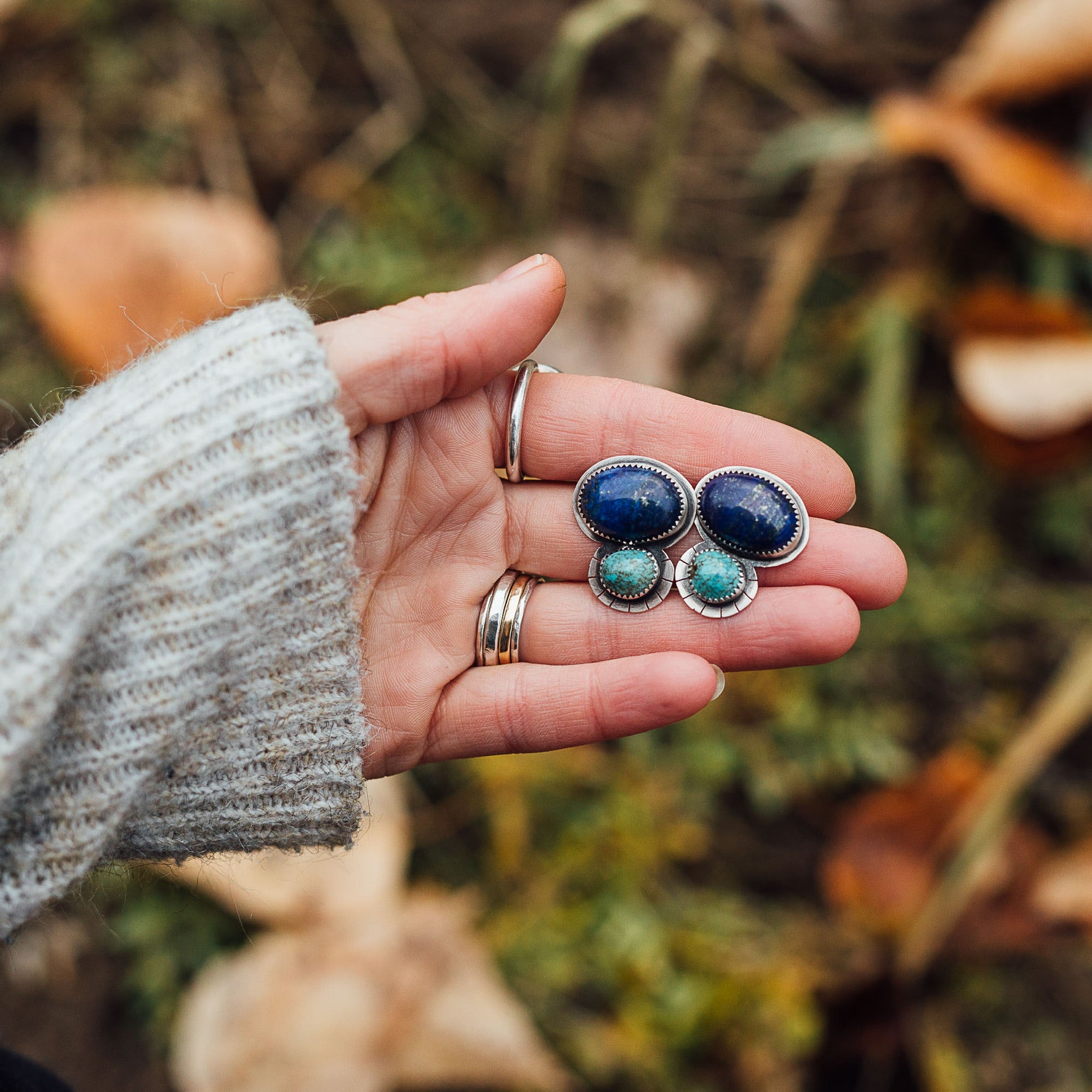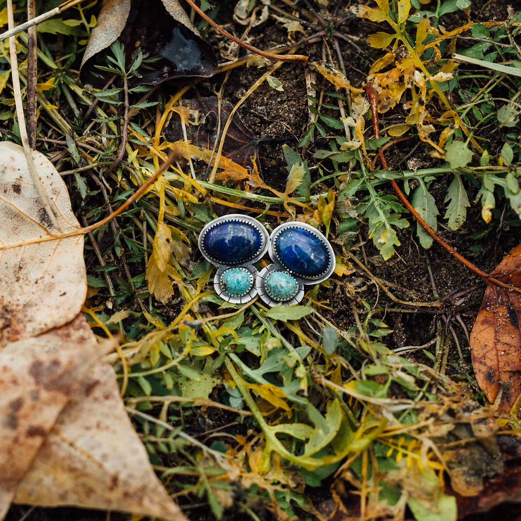 Stunning double stone post earrings featuring Lapis Lazuli and America mined No. 8 turquoise with hand sawed sunburst details along the base. Posts are sturdy and comfortable with sterling silver earnuts. Earrings are oxidzed and polished for a soft rustic finish and measure about 1 inch from top to bottom.