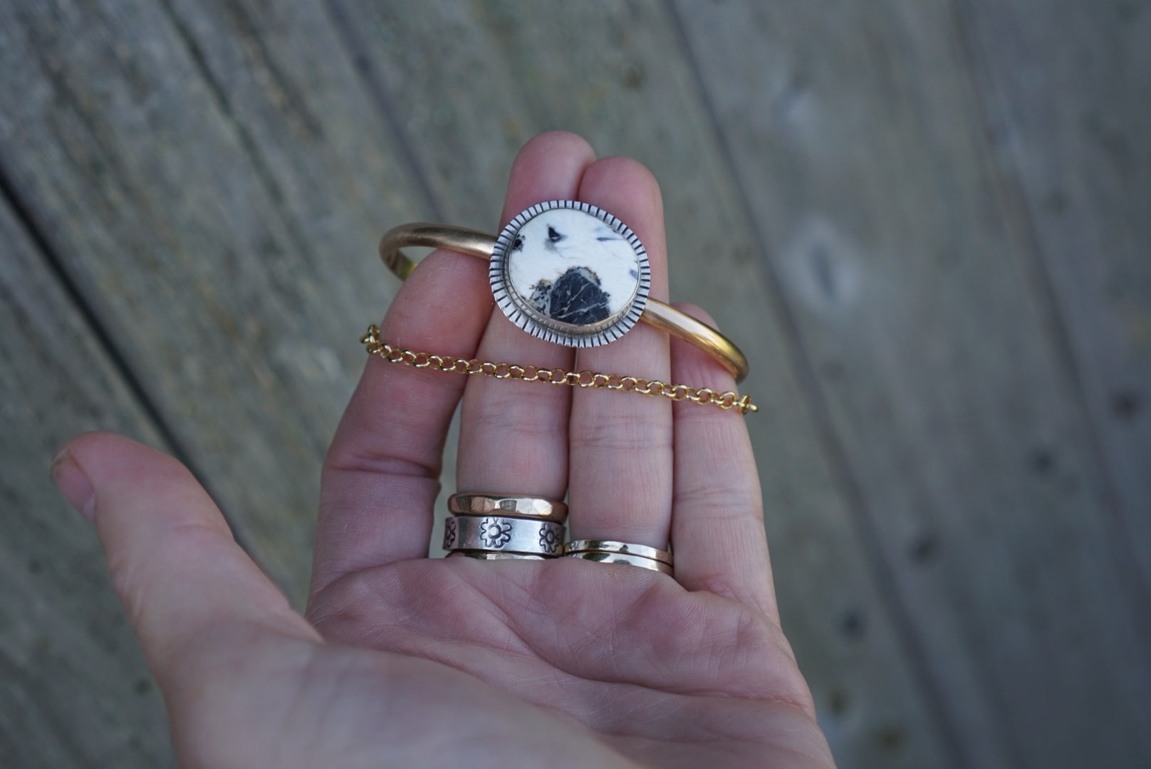 This cuff is so fun! It features a beautiful 14K gold fill stacking cuff with a lovely White Buffalo Turquoise stone set in sterling silver with stamped details, and has an attached 14k Goldfill rolo chain bracelet for easy stacking with other cuffs or bracelets. Cuff measures 5.5 inches with a 1-1.5 inch opening and can be squeezed shut or pulled open for a good fit.