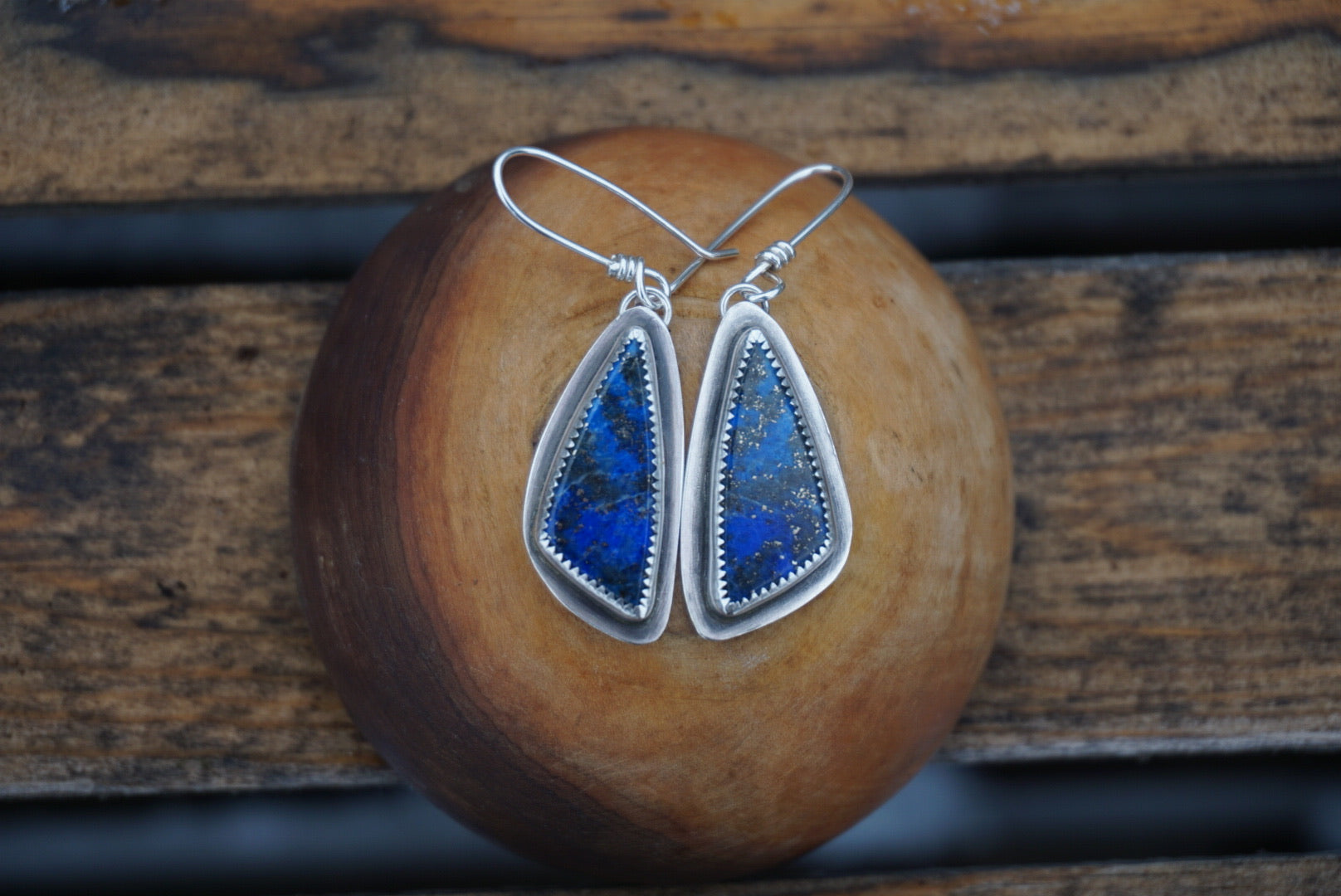 Beautiful pieces of Lapus Lazuli that are dark blue with black and pyrite flecks are simply set in fine and sterling silver and dangle from hand crafted sterling silver earwires. Earrings measure just about 2 inches in length from the top of the  earwires the tip of the stone. The absolute perfect earrings for everyday.